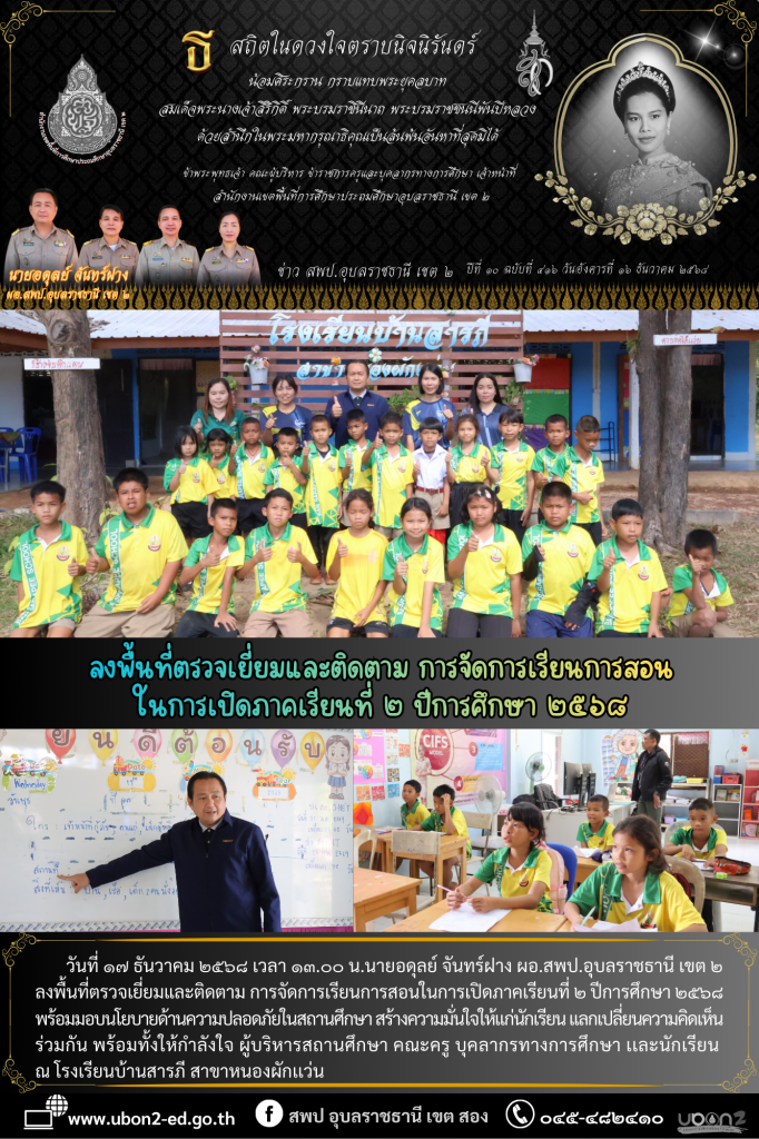 วันที่ ๑๗ ธันวาคม ๒๕๖๘ เวลา ๑๓.๐๐ น.นายอดุลย์ จันทร์ฝาง ผอ.สพป.อุบลราชธานี เขต ๒ ลงพื้นที่ตรวจเยี่ยมและติดตาม การจัดการเรียนการสอนในการเปิดภาคเรียนที่ ๒ ปีการศึกษา ๒๕๖๘ พร้อมมอบนโยบายด้านความปลอดภัยในสถานศึกษา สร้างความมั่นใจให้แก่นักเรียน แลกเปลี่ยนความคิดเห็นร่วมกัน พร้อมทั้งให้กำลังใจ ผู้บริหารสถานศึกษา คณะครู บุคลากรทางการศึกษา เเละนักเรียน ณ โรงเรียนบ้านสารภี สาขาหนองผักเเว่น