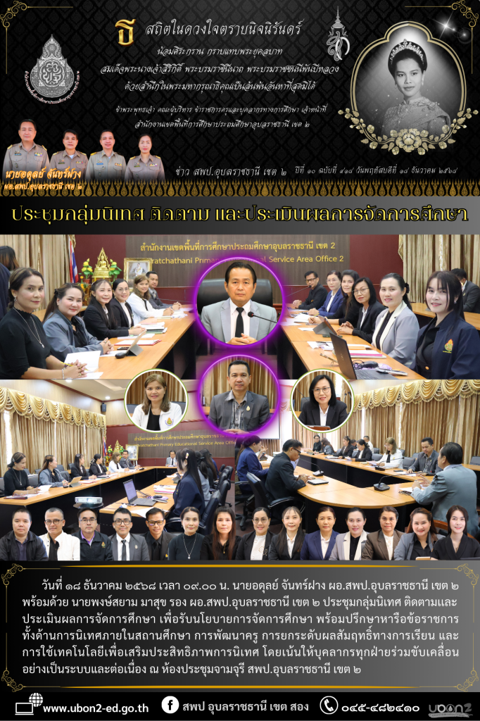 วันที่ ๑๘ ธันวาคม ๒๕๖๘ เวลา ๐๙.๐๐ น. นายอดุลย์ จันทร์ฝาง ผอ.สพป.อุบลราชธานี เขต ๒ พร้อมด้วย นายพงษ์สยาม มาสุข รอง ผอ.สพป.อุบลราชธานี เขต ๒ ประชุมกลุ่มนิเทศ ติดตามเเละประเมินผลการจัดการศึกษา เพื่อรับนโยบายการจัดการศึกษา พร้อมปรึกษาหารือข้อราชการ ทั้งด้านการนิเทศภายในสถานศึกษา การพัฒนาครู การยกระดับผลสัมฤทธิ์ทางการเรียน และการใช้เทคโนโลยีเพื่อเสริมประสิทธิภาพการนิเทศ โดยเน้นให้บุคลากรทุกฝ่ายร่วมขับเคลื่อนอย่างเป็นระบบและต่อเนื่อง ณ ห้องประชุมจามจุรี สพป.อุบลราชธานี เขต ๒