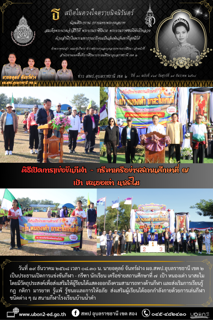 วันที่ ๑๙ ธันวาคม ๒๕๖๘ เวลา ๐๘.๓๐ น. นายอดุลย์ จันทร์ฝาง ผอ.สพป.อุบลราชธานี เขต ๒ เป็นประธานเปิดการเเข่งขันกีฬา – กรีฑา นักเรียน เครือข่ายสถานศึกษาที่ ๗ เป้า หนองเต่า นาสะไม โดยมีวัตถุประสงค์เพื่อส่งเสริมให้ผู้รียนได้เเสดงออกถึงควมสามารถทางด้านกีฬา เเละส่งเริมการเรียนรู้ กฎ กติกา มารยาท รู้เเพ้ รู้ชนะเเละการให้อภัย ส่งเสริมผู้เรียนได้ออกกำลังกายด้วยการเล่นกีฬาชนิดต่างๆ ณ สนามกีฬาโรงเรียนบ้านน้ำคำ