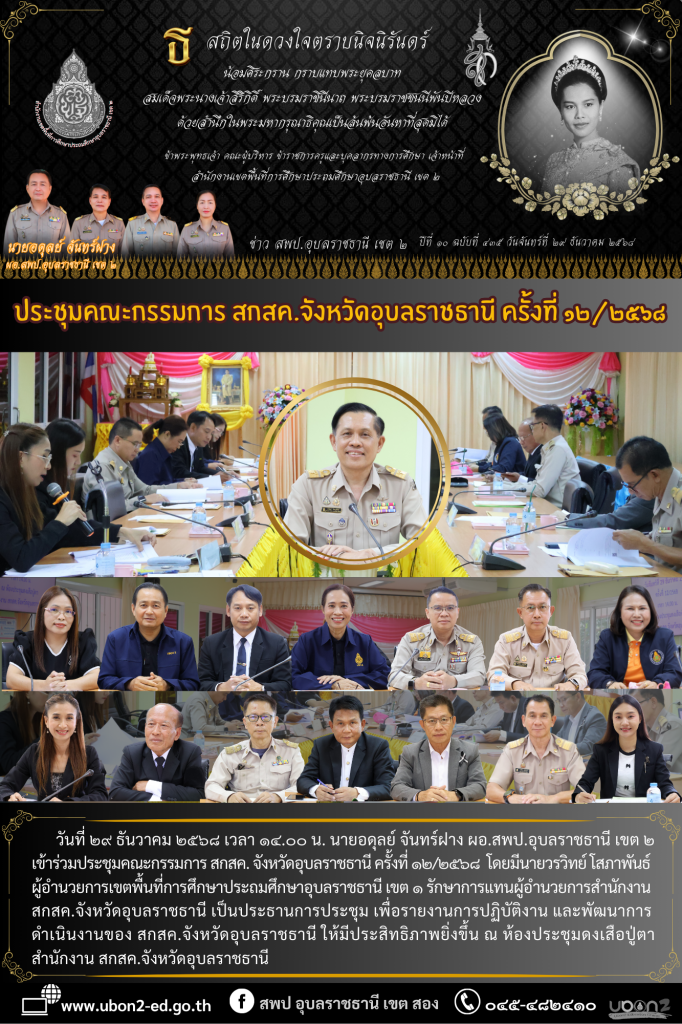 วันที่ ๒๙ ธันวาคม ๒๕๖๘ เวลา ๑๔.๐๐ น. นายอดุลย์ จันทร์ฝาง ผอ.สพป.อุบลราชธานี เขต ๒ เข้าร่วมประชุมคณะกรรมการ สกสค. จังหวัดอุบลราชธานี ครั้งที่ ๑๒/๒๕๖๘ โดยมีนายวรวิทย์ โสภาพันธ์ ผู้อำนวยการเขตพื้นที่การศึกษาประถมศึกษาอุบลราชธานี เขต ๑ รักษาการแทนผู้อำนวยการสำนักงาน สกสค.จังหวัดอุบลราชธานี เป็นประธานการประชุม เพื่อรายงานการปฏิบัติงาน และพัฒนาการดำเนินงานของ สกสค.จังหวัดอุบลราชธานี ให้มีประสิทธิภาพยิ่งขึ้น ณ ห้องประชุมดงเสือปู่ตา สำนักงาน สกสค.จังหวัดอุบลราชธานี