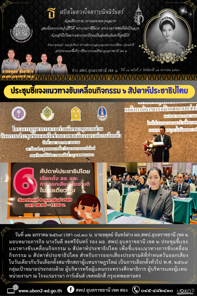 วันที่ ๑๒ มกราคม ๒๕๖๙ เวลา ๐๘.๓๐ น. นายอดุลย์ จันทร์ฝาง ผอ.สพป.อุบลราชธานี เขต ๒ มอบหมายภารกิจ นางวันดี ละศรีจันทร์ รอง ผอ. สพป.อุบลราชธานี เขต ๒ ประชุมชี้เเจงเเนวทางขับเคลื่อนกิจกรรม ๖ สัปดาห์ประชาธิปไตย เพื่อชี้เเจงเเนวทางการขับเคลื่อนกิจกรรม ๖ สัปดาห์ประชาธิปไตย สำหรับการออกเสียงประชามติที่กำหนดวันออกเสียงในวันเดียวกับวันเลือกตั้งสมาชิกสภาผู้เเทนราษฎรใหม่ เป็นการเลือกตั้งทั่วไป พ.ศ. ๒๕๖๙ กลุ่มเป้าหมายประกอบด้วย ผู้บริหารหรือผู้เเทนกระทรวงศึกษาธิการ ผู้บริหารเเละผู้เเทนหน่วยงานฯ ณ โรงเเรมรามา การ์เด้นส์ เขตหลักสี่ กรุงเทพมหานคร