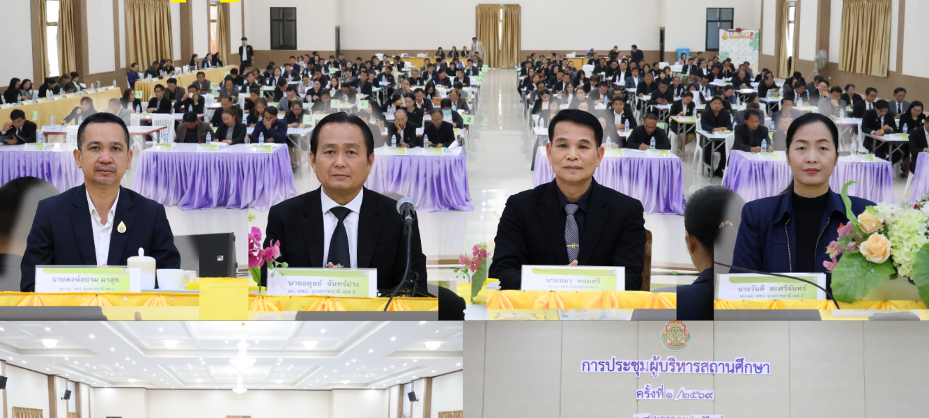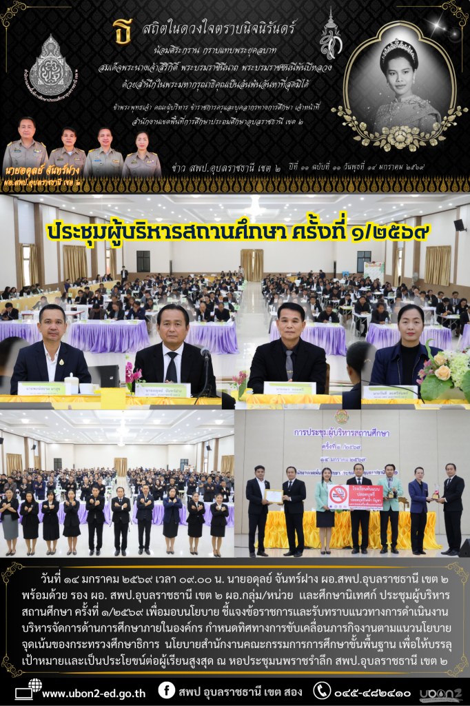 วันที่ ๑๔ มกราคม ๒๕๖๙ เวลา ๐๘.๓๐ น. นายอดุลย์ จันทร์ฝาง ผอ.สพป.อุบลราชธานี เขต ๒ พร้อมด้วย รอง ผอ. สพป.อุบลราชธานี เขต ๒ ผอ.กลุ่ม/หน่วย เเละศึกษานิเทศก์ ประชุมผู้บริหารสถานศึกษา ครั้งที่ ๑/๒๕๖๙ เพื่อมอบนโยบาย ชี้แจงข้อราชการเเละรับทราบแนวทางการดำเนินงาน บริหารจัดการด้านการศึกษาภายในองค์กร กำหนดทิศทางการขับเคลื่อนภารกิจงานตามแนวนโยบายจุดเน้นของกระทรวงศึกษาธิการ นโยบายสำนักงานคณะกรรมการการศึกษาขั้นพื้นฐาน เพื่อให้บรรลุเป้าหมายเเละเป็นประโยขน์ต่อผู้เรียนสูงสุด ณ หอประชุมนพราชรำลึก สพป.อุบลราชธานี เขต ๒