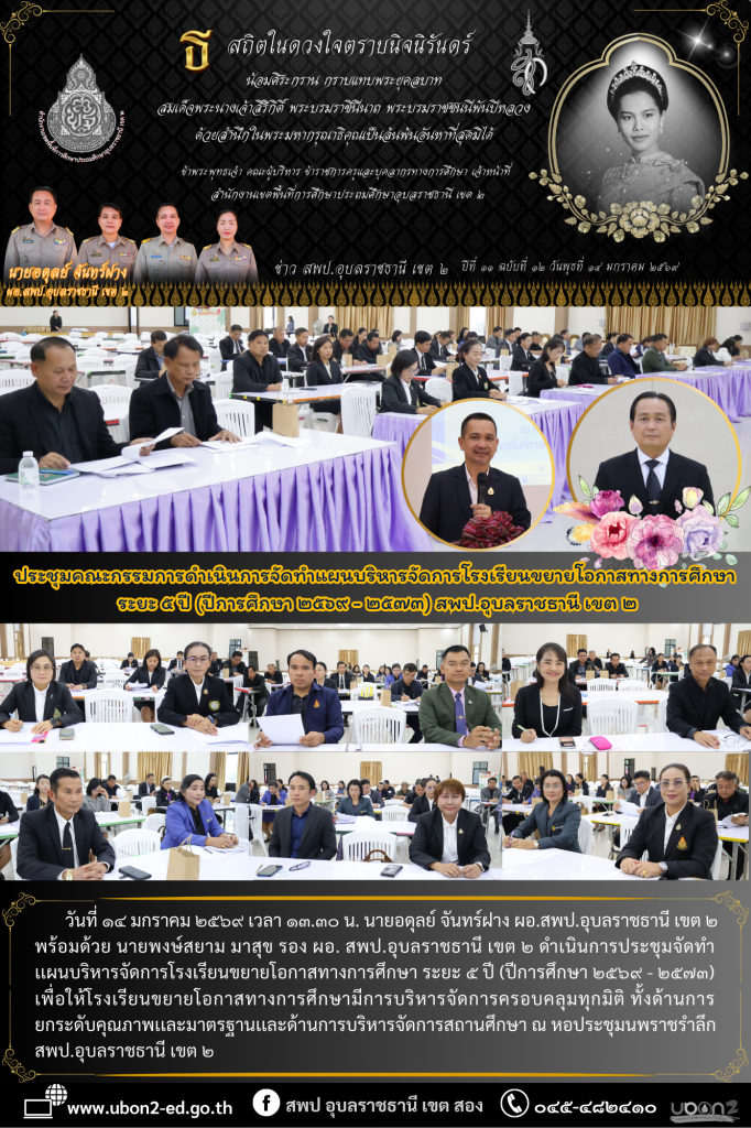 วันที่ ๑๔ มกราคม ๒๕๖๙ เวลา ๑๓.๓๐ น. นายอดุลย์ จันทร์ฝาง ผอ.สพป.อุบลราชธานี เขต ๒ พร้อมด้วย นายพงษ์สยาม มาสุข รอง ผอ. สพป.อุบลราชธานี เขต ๒ ดำเนินการประชุมจัดทำเเผนบริหารจัดการโรงเรียนขยายโอกาสทางการศึกษา ระยะ ๕ ปี (ปีการศึกษา ๒๕๖๙ – ๒๕๗๓) เพื่อให้โรงเรียนขยายโอกาสทางการศึกษามีการบริหารจัดการครอบคลุมทุกมิติ ทั้งด้านการยกระดับคุณภาพเเละมาตรฐานเเละด้านการบริหารจัดการสถานศึกษา ณ หอประชุมนพราชรำลึก สพป.อุบลราชธานี เขต ๒