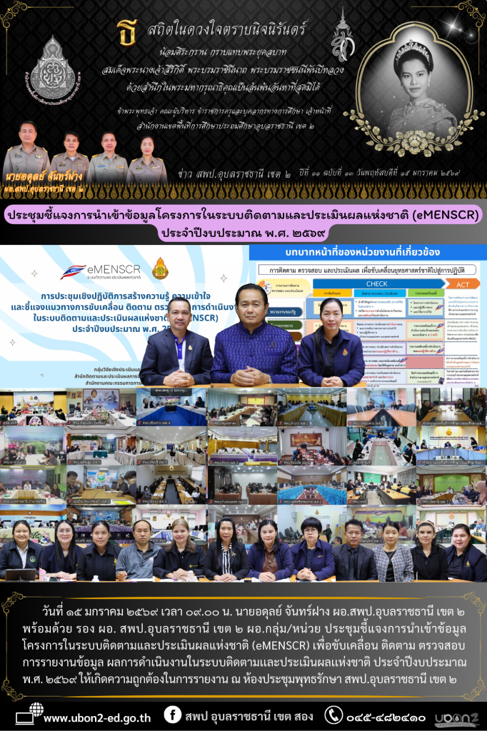 วันที่ ๑๕ มกราคม ๒๕๖๙ เวลา ๐๙.๐๐ น. นายอดุลย์ จันทร์ฝาง ผอ.สพป.อุบลราชธานี เขต ๒ พร้อมด้วย รอง ผอ. สพป.อุบลราชธานี เขต ๒ ผอ.กลุ่ม/หน่วย ประชุมชี้แจงการนำเข้าข้อมูลโครงการในระบบติดตามและประเมินผลแห่งชาติ (eMENSCR) เพื่อขับเคลื่อน ติดตาม ตรวจสอบ การรายงานข้อมูล ผลการดำเนินงานในระบบติดตามเเละประเมินผลเเห่งชาติ ประจำปีงบประมาณ พ.ศ. ๒๕๖๙ ให้เกิดความถูกต้องในการรายงาน ณ ห้องประชุมพุทธรักษา สพป.อุบลราชธานี เขต ๒