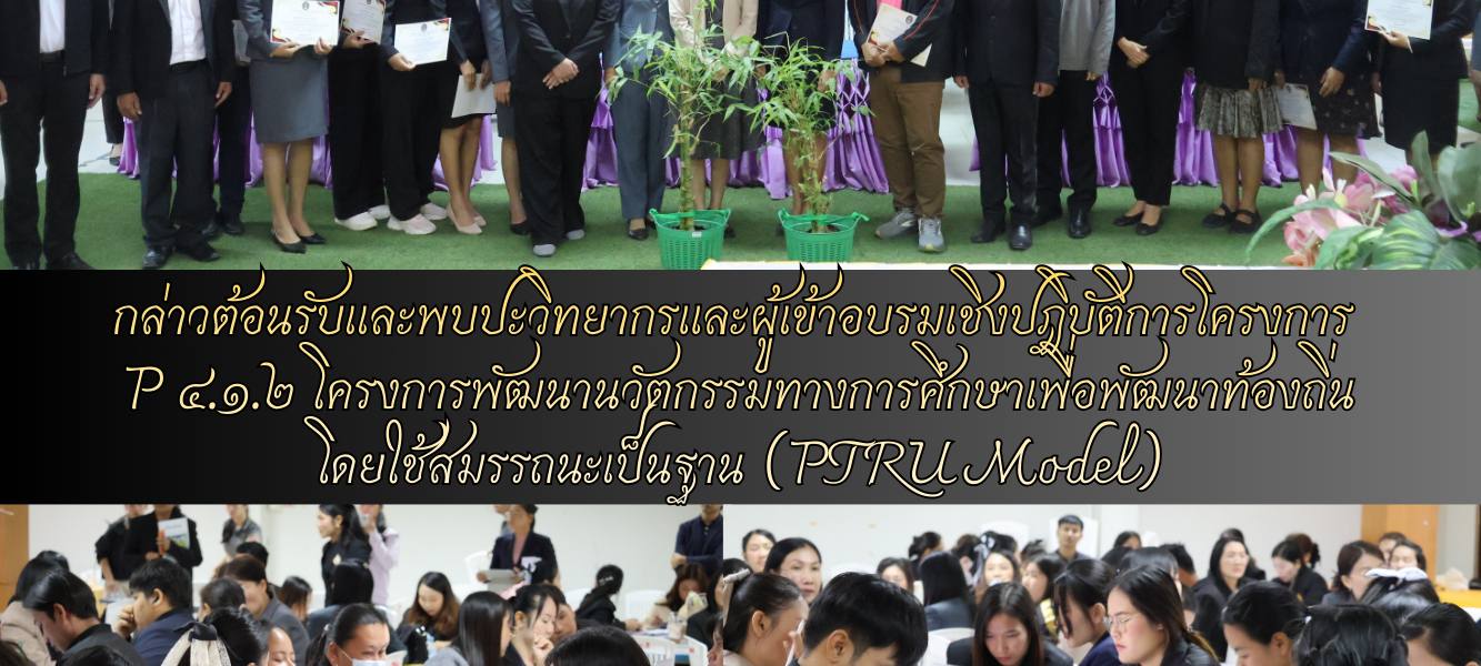 กล่าวต้อนรับและพบปะวิทยากรและผู้เข้าอบรมเชิงปฏิบัติการโครงการ P ๔.๑.๒ โครงการพัฒนานวัตกรรมทางการศึกษาเพื่อพัฒนาท้องถิ่นโดยใช้สมรรถนะเป็นฐาน (PTRU Model)