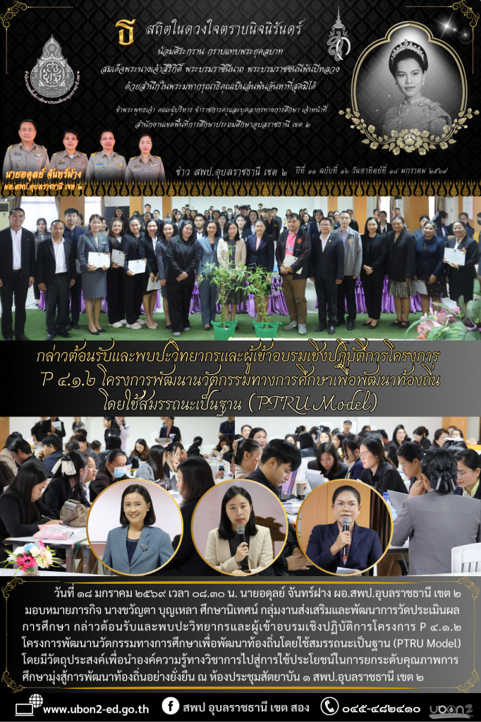 วันที่ ๑๘ มกราคม ๒๕๖๙ เวลา ๐๘.๓๐ น. นายอดุลย์ จันทร์ฝาง ผอ.สพป.อุบลราชธานี เขต ๒ มอบหมายภารกิจ นางขวัญตา บุญเหลา ศึกษานิเทศน์ กลุ่มงานส่งเสริมและพัฒนาการวัดประเมินผลการศึกษา กล่าวต้อนรับและพบปะวิทยากรและผู้เข้าอบรมเชิงปฏิบัติการโครงการ P ๔.๑.๒ โครงการพัฒนานวัตกรรมทางการศึกษาเพื่อพัฒนาท้องถิ่นโดยใช้สมรรถนะเป็นฐาน (PTRU Model) โดยมีวัตถุประสงค์เพื่อนำองค์ความรู้ทางวิชาการไปสู่การใช้ประโยชน์ในการยกระดับคุณภาพการศึกษามุ่งสู้การพัฒนาท้องถิ่นอย่างยั่งยืน ณ ห้องประชุมสัตยาบัน ๑ สพป.อุบลราชธานี เขต ๒