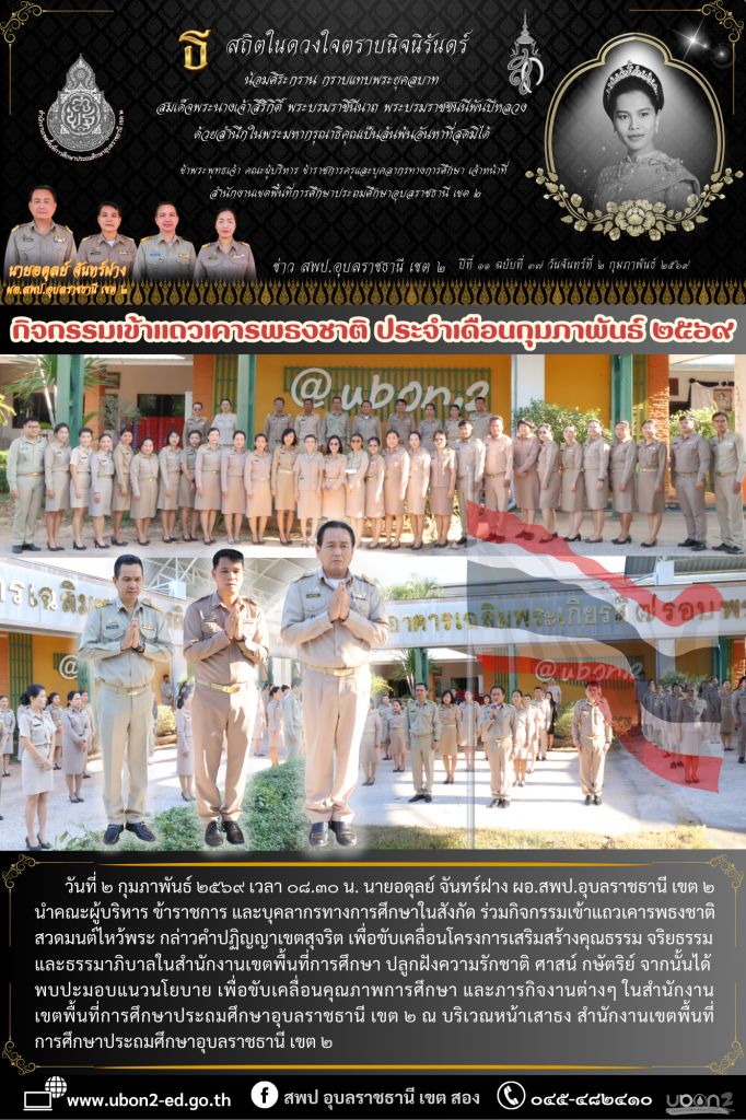 วันที่ ๒ กุมภาพันธ์ ๒๕๖๙ เวลา ๐๘.๓๐ น. นายอดุลย์ จันทร์ฝาง ผอ.สพป.อุบลราชธานี เขต ๒ นำคณะผู้บริหาร ข้าราชการ และบุคลากรทางการศึกษาในสังกัด ร่วมกิจกรรมเข้าแถวเคารพธงชาติ สวดมนต์ไหว้พระ กล่าวคำปฏิญญาเขตสุจริต เพื่อขับเคลื่อนโครงการเสริมสร้างคุณธรรม จริยธรรมและธรรมาภิบาลในสำนักงานเขตพื้นที่การศึกษา ปลูกฝังความรักชาติ ศาสน์ กษัตริย์ จากนั้นได้พบปะมอบแนวนโยบาย เพื่อขับเคลื่อนคุณภาพการศึกษา และภารกิจงานต่างๆ ในสำนักงานเขตพื้นที่การศึกษาประถมศึกษาอุบลราชธานี เขต ๒ ณ บริเวณหน้าเสาธง สำนักงานเขตพื้นที่การศึกษาประถมศึกษาอุบลราชธานี เขต ๒