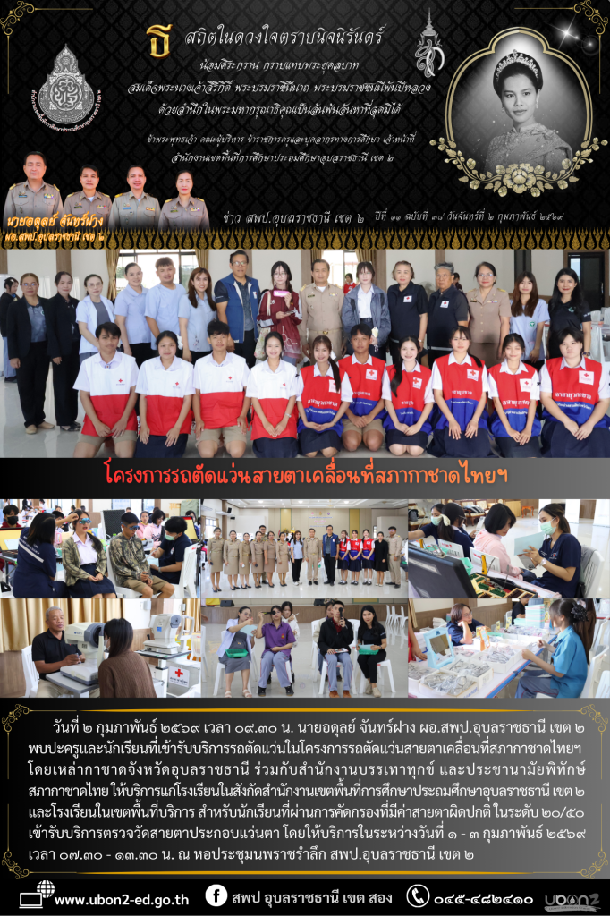 วันที่ ๒ กุมภาพันธ์ ๒๕๖๙ เวลา ๐๙.๓๐ น. นายอดุลย์ จันทร์ฝาง ผอ.สพป.อุบลราชธานี เขต ๒ พบปะครูเเละนักเรียนที่เข้ารับบริการรถตัดแว่นในโครงการรถตัดแว่นสายตาเคลื่อนที่สภากาชาดไทยฯ โดยเหล่ากาชาดจังหวัดอุบลราชธานี ร่วมกับสำนักงานบรรเทาทุกข์ และประชานามัยพิทักษ์ สภากาชาดไทย ให้บริการเเก่โรงเรียนในสังกัดสำนักงานเขตพื้นที่การศึกษาประถมศึกษาอุบลราชธานี เขต ๒ เเละโรงเรียนในเขตพื้นที่บริการ สำหรับนักเรียนที่ผ่านการคัดกรองที่มีค่าสายตาผิดปกติ ในระดับ ๒๐/๕๐ เข้ารับบริการตรวจวัดสายตาประกอบแว่นตา โดยให้บริการในระหว่างวันที่ ๑ – ๓ กุมภาพันธ์ ๒๕๖๙ เวลา ๐๗.๓๐ – ๑๓.๓๐ น. ณ หอประชุมนพราชรำลึก สพป.อุบลราชธานี เขต ๒