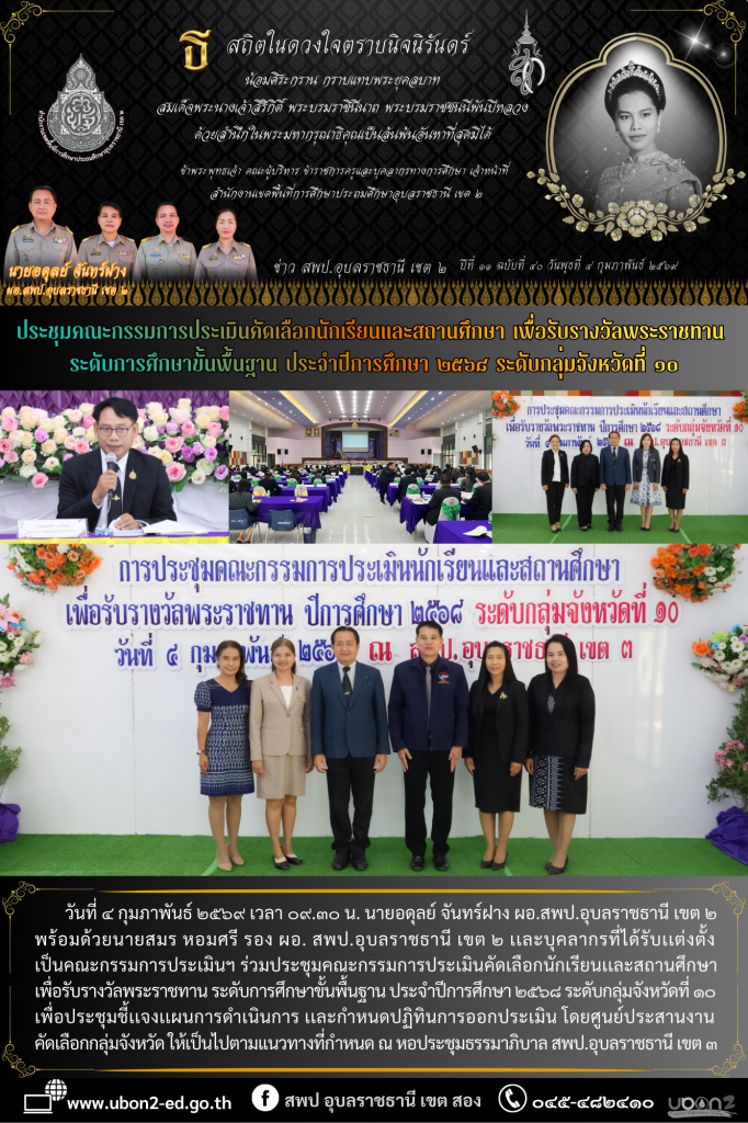 วันที่ ๔ กุมภาพันธ์ ๒๕๖๙ เวลา ๐๙.๓๐ น. นายอดุลย์ จันทร์ฝาง ผอ.สพป.อุบลราชธานี เขต ๒ พร้อมด้วยนายสมร หอมศรี รอง ผอ. สพป.อุบลราชธานี เขต ๒ เเละบุคลากรที่ได้รับเเต่งตั้งเป็นคณะกรรมการประเมินฯ ร่วมประชุมคณะกรรมการประเมินคัดเลือกนักเรียนเเละสถานศึกษา เพื่อรับรางวัลพระราชทาน ระดับการศึกษาขั้นพื้นฐาน ประจำปีการศึกษา ๒๕๖๘ ระดับกลุ่มจังหวัดที่ ๑๐ เพื่อประชุมชี้เเจงเเผนการดำเนินการ เเละกำหนดปฏิทินการออกประเมิน โดยศูนย์ประสานงานคัดเลือกกลุ่มจังหวัด ให้เป็นไปตามแนวทางที่กำหนด ณ หอประชุมธรรมาภิบาล สพป.อุบลราชธานี เขต ๓