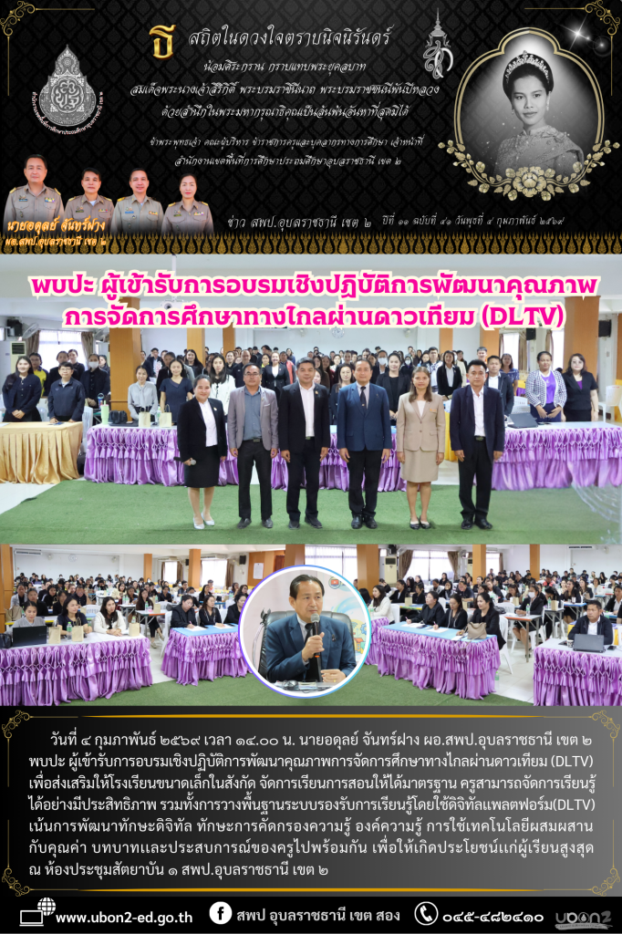 วันที่ ๔ กุมภาพันธ์ ๒๕๖๙ เวลา ๑๔.๐๐ น. นายอดุลย์ จันทร์ฝาง ผอ.สพป.อุบลราชธานี เขต ๒ พบปะ ผู้เข้ารับการอบรมเชิงปฏิบัติการพัฒนาคุณภาพการจัดการศึกษาทางไกลผ่านดาวเทียม (DLTV) เพื่อส่งเสริมให้โรงเรียนขนาดเล็กในสังกัด จัดการเรียนการสอนให้ได้มาตรฐาน ครูสามารถจัดการเรียนรู้ได้อย่างมีประสิทธิภาพ รวมทั้งการวางพื้นฐานระบบรองรับการเรียนรู้โดยใช้ดิจิทัลเเพลตฟอร์ม(DLTV) เน้นการพัฒนาทักษะดิจิทัล ทักษะการคัดกรองความรู้ องค์ความรู้ การใช้เทคโนโลยีผสมผสานกับคุณค่า บทบาทเเละประสบการณ์ของครูไปพร้อมกัน เพื่อให้เกิดประโยชน์เเก่ผู้เรียนสูงสุด ณ ห้องประชุมสัตยาบัน ๑ สพป.อุบลราชธานี เขต ๒