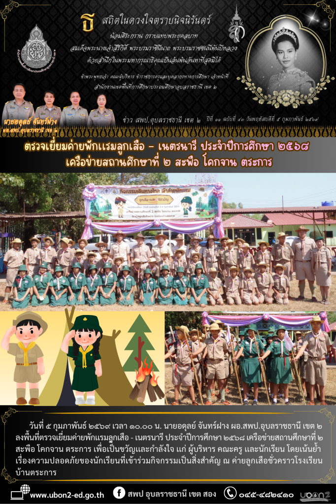 วันที่ ๕ กุมภาพันธ์ ๒๕๖๙ เวลา ๑๐.๐๐ น. นายอดุลย์ จันทร์ฝาง ผอ.สพป.อุบลราชธานี เขต ๒ ลงพื้นที่ตรวจเยี่ยมค่ายพักเเรมลูกเสือ – เนตรนารี ประจำปีการศึกษา ๒๕๖๘ เครือข่ายสถานศึกษาที่ ๒ สะพือ โคกจาน ตระการ เพื่อเป็็นขวัญเเละกำลังใจ เเก่ ผู้บริหาร คณะครู เเละนักเรียน โดยเน้นย้ำ เรื่องความปลอดภัยของนักเรียนที่เข้าร่วมกิจกรรมเป็นสิ่งสำคัญณ ค่ายลูกเสือชั่วคราวโรงเรียนบ้านตระการ