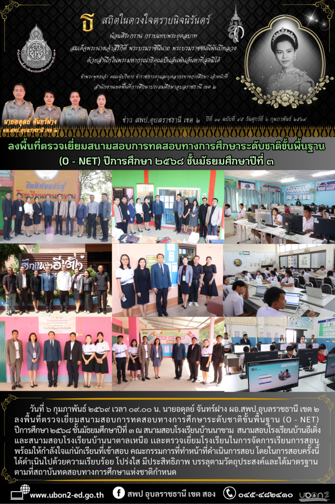 วันที่ ๖ กุมภาพันธ์ ๒๕๖๙ เวลา ๐๙.๐๐ น. นายอดุลย์ จันทร์ฝาง ผอ.สพป.อุบลราชธานี เขต ๒ ลงพื้นที่ตรวจเยี่ยมสนามสอบการทดสอบทางการศึกษาระดับชาติขั้นพื้นฐาน (O – NET) ปีการศึกษา ๒๕๖๘ ชั้นมัธยมศึกษาปีที่ ๓ ณ สนามสอบโรงเรียนบ้านนาขาม สนามสอบโรงเรียนบ้านอีเติ่ง และสนามสอบโรงเรียนบ้านนาตาลเหนือ เเละตรวจเยี่ยมโรงเรียนในการจัดการเรียนการสอน พร้อมให้กำลังใจแก่นักเรียนที่เข้าสอบ คณะกรรมการที่ทำหน้าที่ดำเนินการสอบ โดยในการสอบครั้งนี้ได้ดำเนินไปด้วยความเรียบร้อย โปร่งใส มีประสิทธิภาพ บรรลุตามวัตถุประสงค์และได้มาตรฐานตามที่สถาบันทดสอบทางการศึกษาแห่งชาติกำหนด