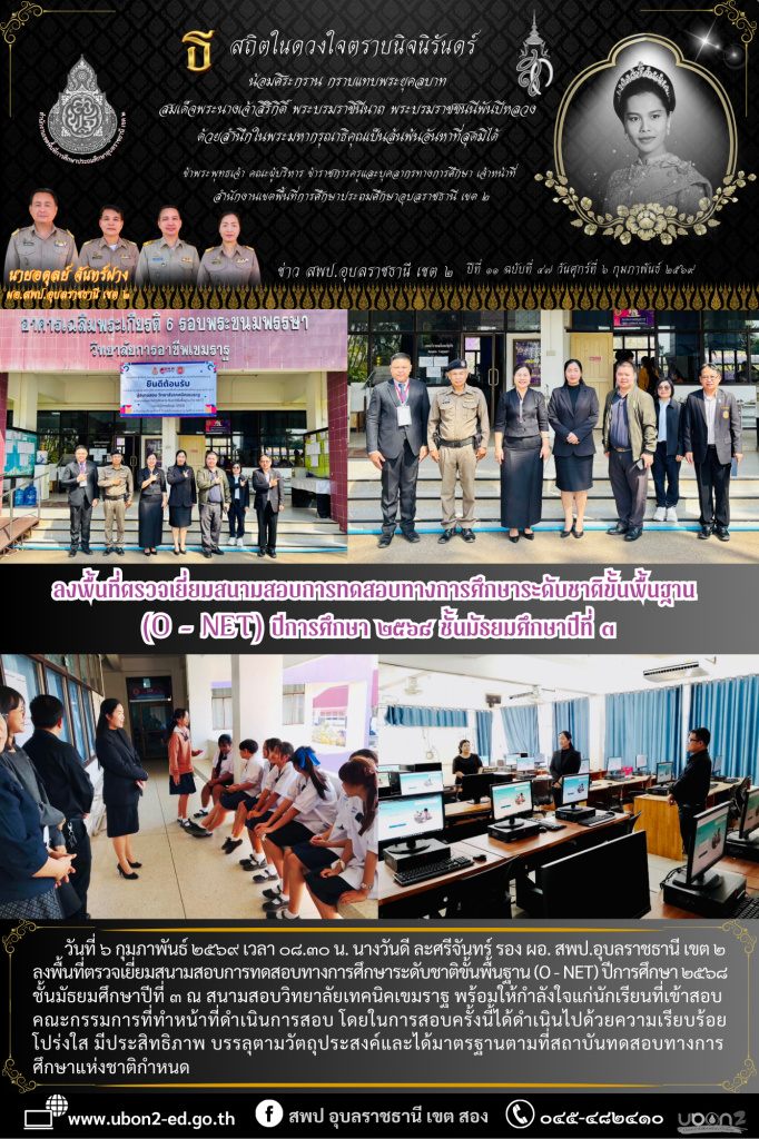 วันที่ ๖ กุมภาพันธ์ ๒๕๖๙ เวลา ๐๘.๓๐ น. นางวันดี ละศรีจันทร์ รอง ผอ. สพป.อุบลราชธานี เขต ๒ ลงพื้นที่ตรวจเยี่ยมสนามสอบการทดสอบทางการศึกษาระดับชาติขั้นพื้นฐาน (O – NET) ปีการศึกษา ๒๕๖๘ ชั้นมัธยมศึกษาปีที่ ๓ ณ สนามสอบวิทยาลัยเทคนิคเขมราฐ พร้อมให้กำลังใจแก่นักเรียนที่เข้าสอบ คณะกรรมการที่ทำหน้าที่ดำเนินการสอบ โดยในการสอบครั้งนี้ได้ดำเนินไปด้วยความเรียบร้อย โปร่งใส มีประสิทธิภาพ บรรลุตามวัตถุประสงค์และได้มาตรฐานตามที่สถาบันทดสอบทางการศึกษาแห่งชาติกำหนด