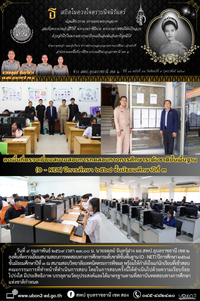 วันที่ ๗ กุมภาพันธ์ ๒๕๖๙ เวลา ๐๘.๓๐ น. นายสมร หอมศรี รอง ผอ.สพป.อุบลราชธานี เขต ๒ ลงพื้นที่ตรวจเยี่ยมสนามสอบการทดสอบทางการศึกษาระดับชาติขั้นพื้นฐาน (O – NET) ปีการศึกษา ๒๕๖๘ ชั้นมัธยมศึกษาปีที่ ๓ ณ สนามสอบวิทยาลัยเทคนิคเขมราฐ พร้อมให้กำลังใจแก่นักเรียนที่เข้าสอบ คณะกรรมการที่ทำหน้าที่ดำเนินการสอบ โดยในการสอบครั้งนี้ได้ดำเนินไปด้วยความเรียบร้อย โปร่งใส มีประสิทธิภาพ บรรลุตามวัตถุประสงค์และได้มาตรฐานตามที่สถาบันทดสอบทางการศึกษาแห่งชาติกำหนด