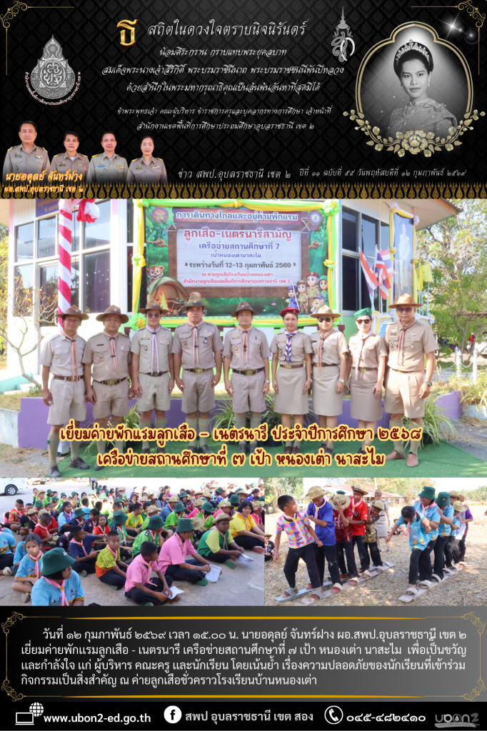 วันที่ ๑๒ กุมภาพันธ์ ๒๕๖๙ เวลา ๑๕.๐๐ น. นายอดุลย์ จันทร์ฝาง ผอ.สพป.อุบลราชธานี เขต ๒ เยี่ยมค่ายพักเเรมลูกเสือ – เนตรนารี เครือข่ายสถานศึกษาที่ ๗ เป้า หนองเต่า นาสะไม เพื่อเป็็นขวัญเเละกำลังใจ เเก่ ผู้บริหาร คณะครู เเละนักเรียน โดยเน้นย้ำ เรื่องความปลอดภัยของนักเรียนที่เข้าร่วมกิจกรรมเป็นสิ่งสำคัญ ณ ค่ายลูกเสือชั่วคราวโรงเรียนบ้านหนองเต่า