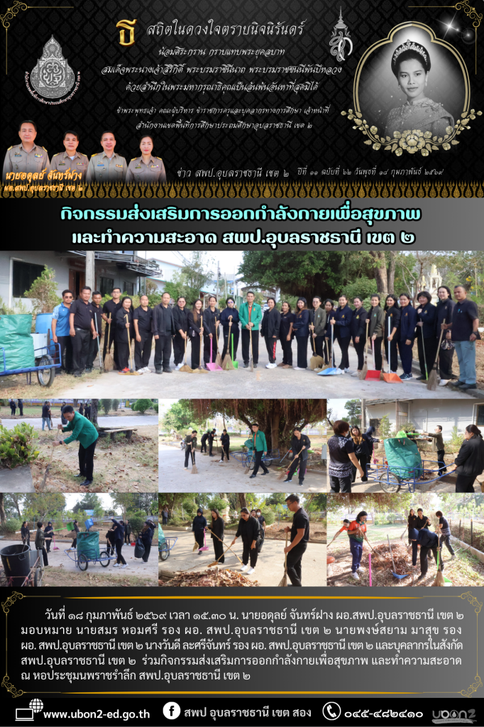 วันที่ ๑๘ กุมภาพันธ์ ๒๕๖๙ เวลา ๑๕.๓๐ น. นายอดุลย์ จันทร์ฝาง ผอ.สพป.อุบลราชธานี เขต ๒ มอบหมาย นายสมร หอมศรี รอง ผอ. สพป.อุบลราชธานี เขต ๒ นายพงษ์สยาม มาสุข รอง ผอ. สพป.อุบลราชธานี เขต ๒ นางวันดี ละศรีจันทร์ รอง ผอ. สพป.อุบลราชธานี เขต ๒ และบุคลากรในสังกัด สพป.อุบลราชธานี เขต ๒ ร่วมกิจกรรมส่งเสริมการออกกำลังกายเพื่อสุขภาพ และทำความสะอาด ณ หอประชุมนพราชรำลึก สพป.อุบลราชธานี เขต ๒