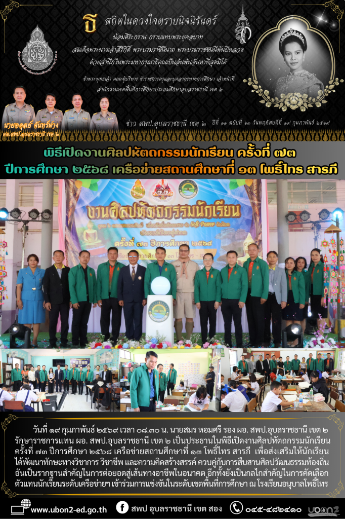 วันที่ ๑๙ กุมภาพันธ์ ๒๕๖๙ เวลา ๐๘.๓๐ น. นายสมร หอมศรี รอง ผอ. สพป.อุบลราชธานี เขต ๒ รักษาราชการเเทน ผอ. สพป.อุบลราชธานี เขต ๒ เป็นประธานในพิธีเปิดงานศิลปหัตถกรรมนักเรียน ครั้งที่ ๗๓ ปีการศึกษา ๒๕๖๘ เครือข่ายสถานศึกษาที่ ๑๓ โพธิ์ไทร สารภี เพื่อส่งเสริมให้นักเรียนได้พัฒนาทักษะทางวิชาการ วิชาชีพ และความคิดสร้างสรรค์ ควบคู่กับการสืบสานศิลปวัฒนธรรมท้องถิ่น อันเป็นรากฐานสำคัญในการต่อยอดสู่เส้นทางอาชีพในอนาคต อีกทั้งยังเป็นกลไกสำคัญในการคัดเลือกตัวแทนนักเรียนระดับเครือข่ายฯ เข้าร่วมการแข่งขันในระดับเขตพื้นที่การศึกษา ณ โรงเรียนอนุบาลโพธิ์ไทร