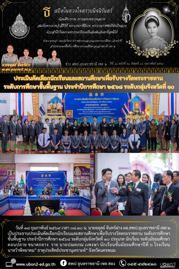 วันที่ ๑๘ กุมภาพันธ์ ๒๕๖๙ เวลา ๐๘.๓๐ น. นายอดุลย์ จันทร์ฝาง ผอ.สพป.อุบลราชธานี เขต ๒ เป็นประธานประเมินคัดเลือกนักเรียนและสถานศึกษาเพื่อรับรางวัลพระราชทาน ระดับการศึกษาขั้นพื้นฐาน ประจำปีการศึกษา ๒๕๖๘ ระดับกลุ่มจังหวัดที่ ๑๐ ประเภท นักเรียน ระดับมัธยมศึกษาตอนปลาย ขนาดกลาง ราย นายปณตภณ เเพงษา นักเรียนชั้นมัธยมศึกษาปีที่ ๖ โรงเรียนนาหว้าพิทยาคม” ธาตุประสิทธ์ประชานุเคราะห์” จังหวัดนครพนม
