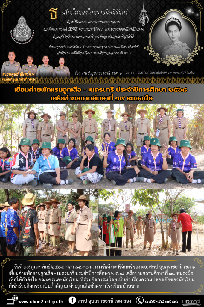 วันที่ ๑๙ กุมภาพันธ์ ๒๕๖๙ เวลา ๑๔.๓๐ น. นางวันดี ละศรีจันทร์ รอง ผอ. สพป.อุบลราชธานี เขต ๒ เยี่ยมค่ายพักแรมลูกเสือ – เนตรนารี ประจำปีการศึกษา ๒๕๖๘ เครือข่ายสถานศึกษาที่ ๑๙ หนองผือ เพื่อให้กำลังใจ คณะครูเเละนักเรียน ที่ร่วมกิจกรรม โดยเน้นย้ำ เรื่องความปลอดภัยของนักเรียนที่เข้าร่วมกิจกรรมเป็นสำคัญ ณ ค่ายลูกเสือชั่วคราวโรงเรียนบ้านบาก