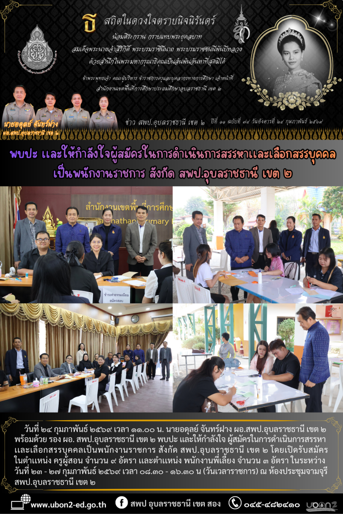 วันที่ ๒๔ กุมภาพันธ์ ๒๕๖๙ เวลา ๑๑.๐๐ น. นายอดุลย์ จันทร์ฝาง ผอ.สพป.อุบลราชธานี เขต ๒ พร้อมด้วย รอง ผอ. สพป.อุบลราชธานี เขต ๒ พบปะ เเละให้กำลังใจ ผู้สมัครในการดำเนินการสรรหาเเละเลือกสรรบุคคลเป็นพนักงานราชการ สังกัด สพป.อุบลราชธานี เขต ๒ โดยเปิดรับสมัครในตำเเหน่ง ครูผู้สอน จำนวน ๙ อัตรา เเละตำเเหน่ง พนักงานพี่เลี้ยง จำนวน ๓ อัตรา ในระหว่างวันที่ ๒๓ – ๒๗ กุมภาพันธ์ ๒๕๖๙ เวลา ๐๘.๓๐ – ๑๖.๓๐ น (วันเวลาราชการ) ณ ห้องประชุมจามจุรี สพป.อุบลราชธานี เขต ๒