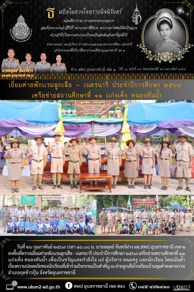 วันที่ ๒๖ กุมภาพันธ์ ๒๕๖๙ เวลา ๑๖.๐๐ น. นายอดุลย์ จันทร์ฝาง ผอ.สพป.อุบลราชธานี เขต ๒ ลงพื้นที่ตรวจเยี่ยมค่ายพักเเรมลูกเสือ – เนตรนารี ประจำปีการศึกษา ๒๕๖๘ เครือข่ายสถานศึกษาที่ ๑๑ เเก่งเค็ง หนองทันน้ำ เพื่อเป็นขวัญเเละกำลังใจ เเก่ ผู้บริหาร คณะครู เเละนักเรียน โดยเน้นย้ำ เรื่องความปลอดภัยของนักเรียนที่เข้าร่วมกิจกรรมเป็นสำคัญ ณ ค่ายลูกเสือโรงเรียนบ้านขุมคำดงตาหวาน อำเภอกุดข้าวปุ้น จังหวัดอุบลราชธานี
