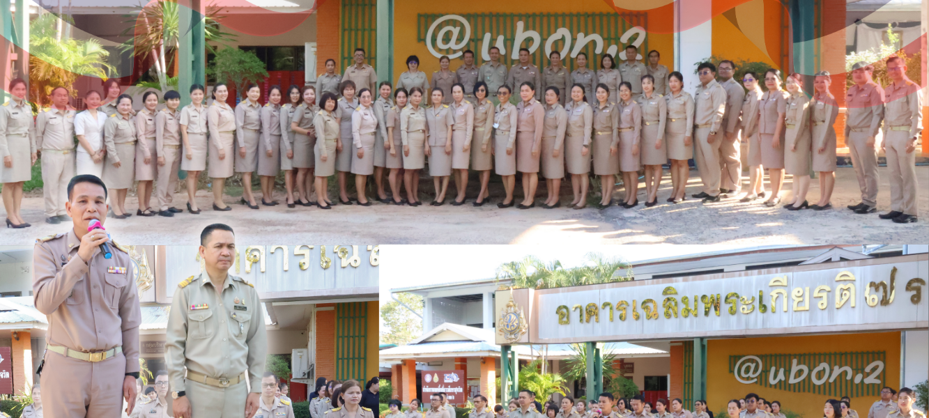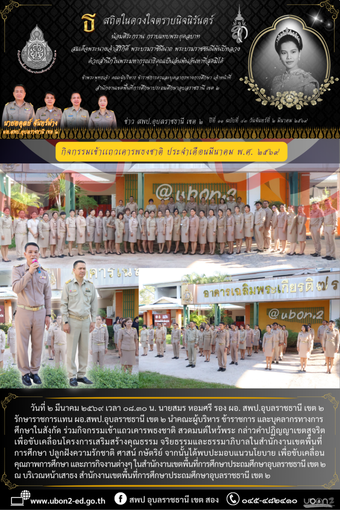 วันที่ ๒ มีนาคม ๒๕๖๙ เวลา ๐๘.๓๐ น. นายสมร หอมศรี รอง ผอ. สพป.อุบลราชธานี เขต ๒ รักษาราชการเเทน ผอ.สพป.อุบลราชธานี เขต ๒ นำคณะผู้บริหาร ข้าราชการ และบุคลากรทางการศึกษาในสังกัด ร่วมกิจกรรมเข้าแถวเคารพธงชาติ สวดมนต์ไหว้พระ กล่าวคำปฏิญญาเขตสุจริต เพื่อขับเคลื่อนโครงการเสริมสร้างคุณธรรม จริยธรรมและธรรมาภิบาลในสำนักงานเขตพื้นที่การศึกษา ปลูกฝังความรักชาติ ศาสน์ กษัตริย์ จากนั้นได้พบปะมอบแนวนโยบาย เพื่อขับเคลื่อนคุณภาพการศึกษา และภารกิจงานต่างๆ ในสำนักงานเขตพื้นที่การศึกษาประถมศึกษาอุบลราชธานี เขต ๒ ณ บริเวณหน้าเสาธง สำนักงานเขตพื้นที่การศึกษาประถมศึกษาอุบลราชธานี เขต ๒