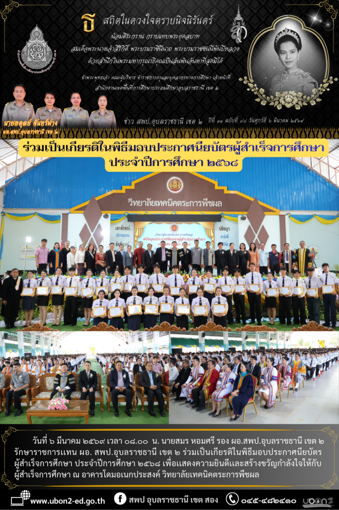 วันที่ ๖ มีนาคม ๒๕๖๙ เวลา ๐๘.๐๐ น. นายสมร หอมศรี รอง ผอ.สพป.อุบลราชธานี เขต ๒ รักษาราชการเเทน ผอ. สพป.อุบลราชธานี เขต ๒ ร่วมเป็นเกียรติในพิธีมอบประกาศนียบัตรผู้สำเร็จการศึกษา ประจำปีการศึกษา ๒๕๖๘ เพื่อเเสดงความยินดีเเละสร้างขวัญกำลังใจให้กับผู้สำเร็จการศึกษา ณ อาคารโดมอเนกประสงค์ วิทยาลัยเทคนิคตระการพืชผล