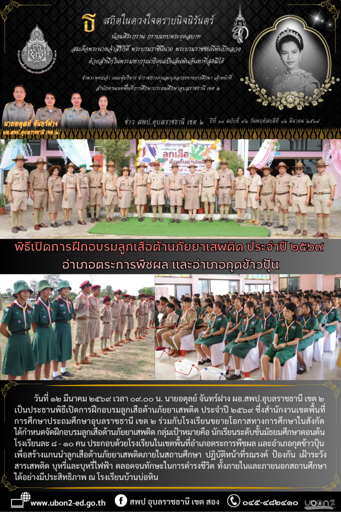 วันที่ ๑๒ มีนาคม ๒๕๖๙ เวลา ๐๙.๐๐ น. นายอดุลย์ จันทร์ฝาง ผอ.สพป.อุบลราชธานี เขต ๒ เป็นประธานพิธีเปิดการฝึกอบรมลูกเสือต้านภัยยาเสพติด ประจำปี ๒๕๖๙ ซึ่งสำนักงานเขตพื้นที่การศึกษาประถมศึกษาอุบลราชธานี เขต ๒ ร่วมกับโรงเรียนขยายโอกาสทางการศึกษาในสังกัด ได้กำหนดจัดฝึกอบรมลูกเสือต้านภัยยาเสพติด กลุ่มเป้าหมายคือ นักเรียนระดับชั้นมัธยมศึกษาตอนต้น โรงเรียนละ ๘ – ๑๐ คน ประกอบด้วยโรงเรียนในเขตพื้นที่อำเภอตระการพืชผล เเละอำเภอกุดข้าวปุ้น เพื่อสร้างแกนนำลูกเสือต้านภัยยาเสพติดภายในสถานศึกษา ปฏิบัติหน้าที่รณรงค์ ป้องกัน เฝ้าระวังสารเสพติด บุหรี่และบุหรี่ไฟฟ้า ตลอดจนทักษะในการดำรงชีวิต ทั้งภายในและภายนอกสถานศึกษาได้อย่างมีประสิทธิภาพ ณ โรงเรียนบ้านบ่อหิน