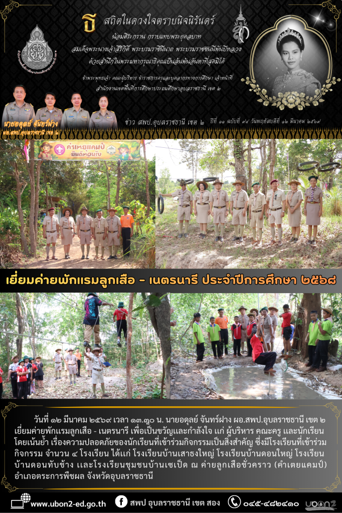 วันที่ ๑๒ มีนาคม ๒๕๖๙ เวลา ๑๓.๓๐ น. นายอดุลย์ จันทร์ฝาง ผอ.สพป.อุบลราชธานี เขต ๒ เยี่ยมค่ายพักเเรมลูกเสือ – เนตรนารี เพื่อเป็็นขวัญเเละกำลังใจ เเก่ ผู้บริหาร คณะครู เเละนักเรียน โดยเน้นย้ำ เรื่องความปลอดภัยของนักเรียนที่เข้าร่วมกิจกรรมเป็นสิ่งสำคัญ ซึ่งมีโรงเรียนที่เข้าร่วมกิจกรรมจำนวน ๔ โรงเรียน ได้เเก่ โรงเรียนบ้านเสาธงใหญ่ โรงเรียนบ้านดอนใหญ่ โรงเรียนบ้านดอนทับช้าง เเละโรงเรียนชุมชนบ้านเซเป็ด ณ ค่ายลูกเสือชั่วคราว (คำเตยแคมป์) อำเภอตระการพืชผล จังหวัดอุบลราชธานี