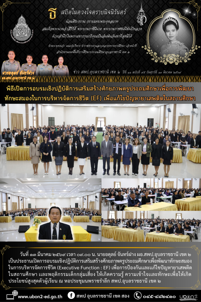 วันที่ ๑๓ มีนาคม ๒๕๖๙ เวลา ๐๙.๐๐ น. นายอดุลย์ จันทร์ฝาง ผอ.สพป.อุบลราชธานี เขต ๒ เป็นประธานเปิดการอบรมเชิงปฏิบัติการเสริมสร้างศักยภาพครูประถมศึกษาเพื่อพัฒนาทักษะสมองในการบริหารจัดการชีวิต (Executive Function : EF) เพื่อการป้องกันเเละเเก้ไขปัญหายาเสพติดในสถานศึกษา เเละพฤติกรรมเด็กกลุ่มเสี่ยง ให้เกิดความรู้ ความเข้าใจเเละทักษะเพื่อให้เกิดประโยชน์สูงสุดตัวผู้เรียน ณ หอประชุมนพราชรำลึก สพป.อุบลราชธานี เขต ๒
