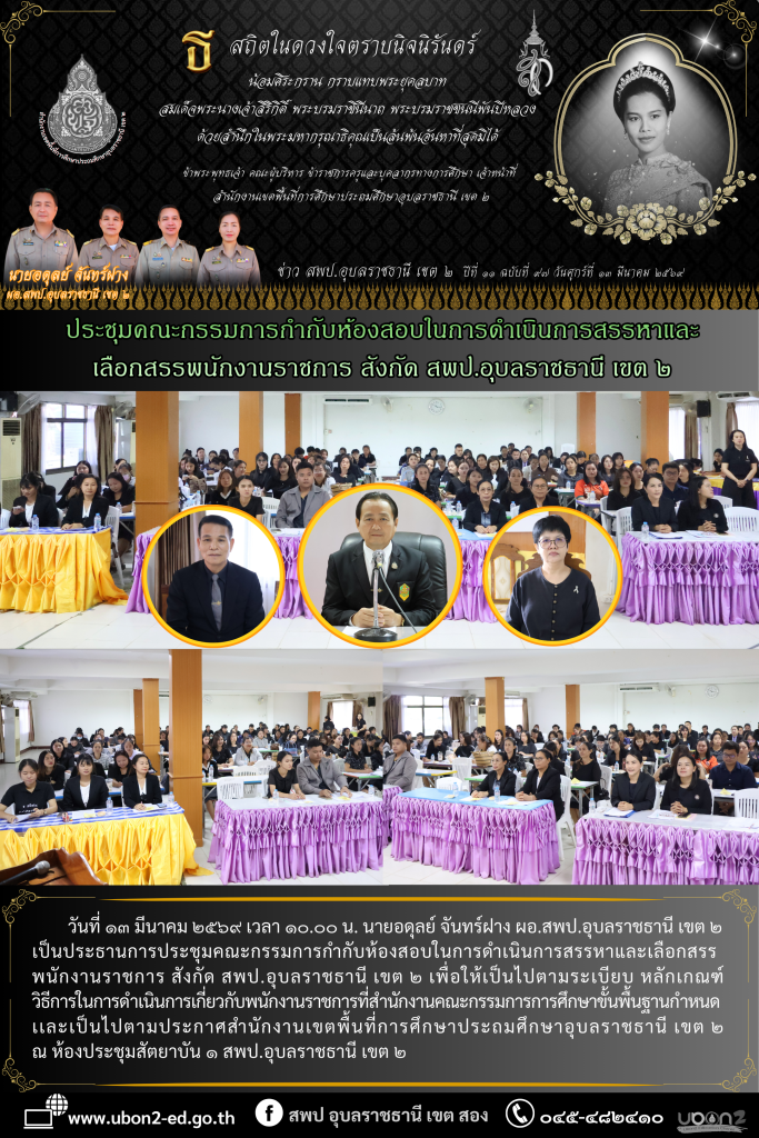 วันที่ ๑๓ มีนาคม ๒๕๖๙ เวลา ๑๐.๐๐ น. นายอดุลย์ จันทร์ฝาง ผอ.สพป.อุบลราชธานี เขต ๒ เป็นประธานการประชุมคณะกรรมการกำกับห้องสอบในการดำเนินการสรรหาและเลือกสรรพนักงานราชการ สังกัด สพป.อุบลราชธานี เขต ๒ เพื่อให้เป็นไปตามระเบียบ หลักเกณฑ์ วิธีการในการดำเนินการเกี่ยวกับพนักงานราชการที่สำนักงานคณะกรรมการการศึกษาขั้นพื้นฐานกำหนด เเละเป็นไปตามประกาศสำนักงานเขตพื้นที่การศึกษาประถมศึกษาอุบลราชธานี เขต ๒ ณ ห้องประชุมสัตยาบัน ๑ สพป.อุบลราชธานี เขต ๒