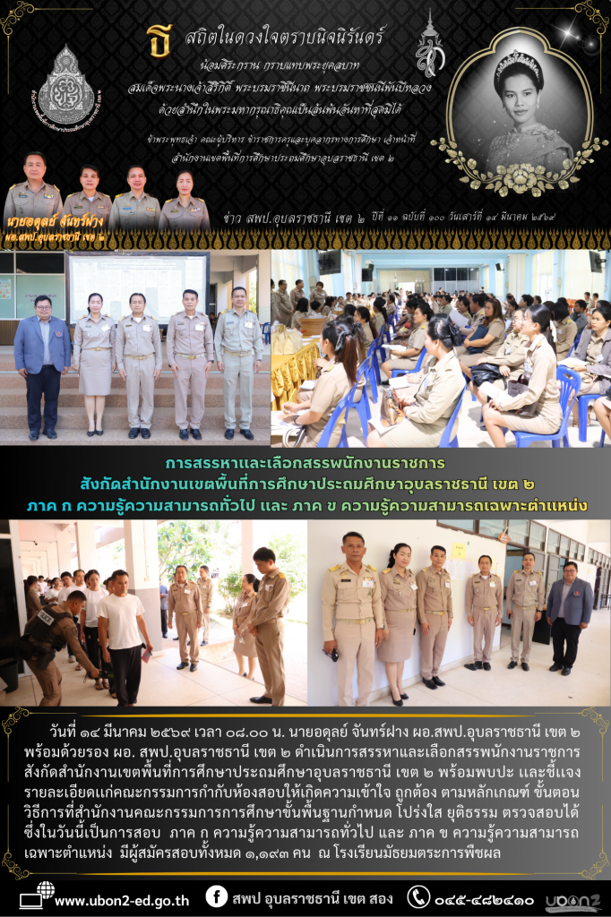 วันที่ ๑๔ มีนาคม ๒๕๖๙ เวลา ๐๘.๐๐ น. นายอดุลย์ จันทร์ฝาง ผอ.สพป.อุบลราชธานี เขต ๒ พร้อมด้วยรอง ผอ. สพป.อุบลราชธานี เขต ๒ ดำเนินการสรรหาและเลือกสรรพนักงานราชการ สังกัดสำนักงานเขตพื้นที่การศึกษาประถมศึกษาอุบลราชธานี เขต ๒ พร้อมพบปะ เเละชี้เเจงรายละเอียดเเก่คณะกรรมการกำกับห้องสอบให้เกิดความเข้าใจ ถูกต้อง ตามหลักเกณฑ์ ขั้นตอน วิธีการที่สำนักงานคณะกรรมการการศึกษาขั้นพื้นฐานกำหนด โปร่งใส ยุติธรรม ตรวจสอบได้ ซึ่งในวันนี้เป็นการสอบ ภาค ก ความรู้ความสามารถทั่วไป และ ภาค ข ความรู้ความสามารถเฉพาะตำแหน่ง มีผู้สมัครสอบทั้งหมด ๑,๑๙๓ คน ณ โรงเรียนมัธยมตระการพืชผล