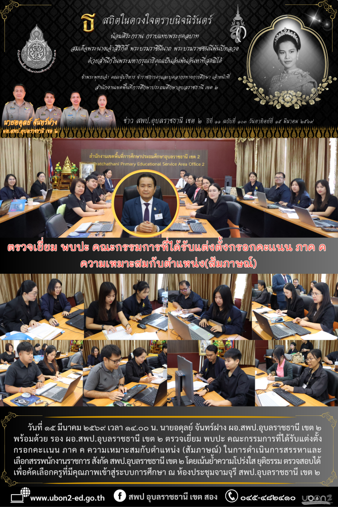 วันที่ ๑๕ มีนาคม ๒๕๖๙ เวลา ๑๔.๐๐ น. นายอดุลย์ จันทร์ฝาง ผอ.สพป.อุบลราชธานี เขต ๒ พร้อมด้วย รอง ผอ.สพป.อุบลราชธานี เขต ๒ ตรวจเยี่ยม พบปะ คณะกรรมการที่ได้รับแต่งตั้งกรอกคะเเนน ภาค ค ความเหมาะสมกับตำแหน่ง (สัมภาษณ์) ในการดำเนินการสรรหาและเลือกสรรพนักงานราชการ สังกัด สพป.อุบลราชธานี เขต ๒ โดยเน้นย้ำความโปร่งใส ยุติธรรม ตรวจสอบได้ เพื่อคัดเลือกครูที่มีคุณภาพเข้าสู่ระบบการศึกษา ณ ห้องประชุมจามจุรี สพป.อุบลราชธานี เขต ๒