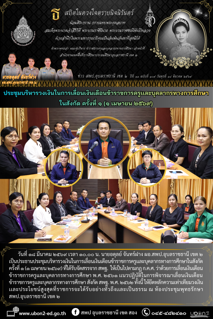 วันที่ ๑๘ มีนาคม ๒๕๖๙ เวลา ๑๐.๐๐ น. นายอดุลย์ จันทร์ฝาง ผอ.สพป.อุบลราชธานี เขต ๒ เป็นประธานประชุมบริหารวงเงินในการเลื่อนเงินเดือนข้าราชการครูเเละบุคลากรทางการศึกษาในสังกัด ครั้งที่ ๑ (๑ เมษายน ๒๕๖๙) ที่ได้รับจัดสรรจาก สพฐ. ให้เป็นไปตามกฏ ก.ค.ศ. ว่าด้วยการเลื่อนเงินเดือนข้าราชการครูและบุคลากรทางการศึกษา พ.ศ. ๒๕๖๑ เเนวปฏิบัติในการพิจารณาเลื่อนเงินเดือนข้าราชการครูเเละบุคลากรทางการศึกษา สังกัด สพฐ. พ.ศ. ๒๕๖๒ ทั้งนี้ ให้ยึดหลักความเท่าเทียมวงเงินเเละประโยชน์สูงสุดที่ราชการจะได้รับอย่างทั่วถึงเเละเป็นธรรม ณ ห้องประชุมพุทธรักษา สพป.อุบลราชธานี เขต ๒
