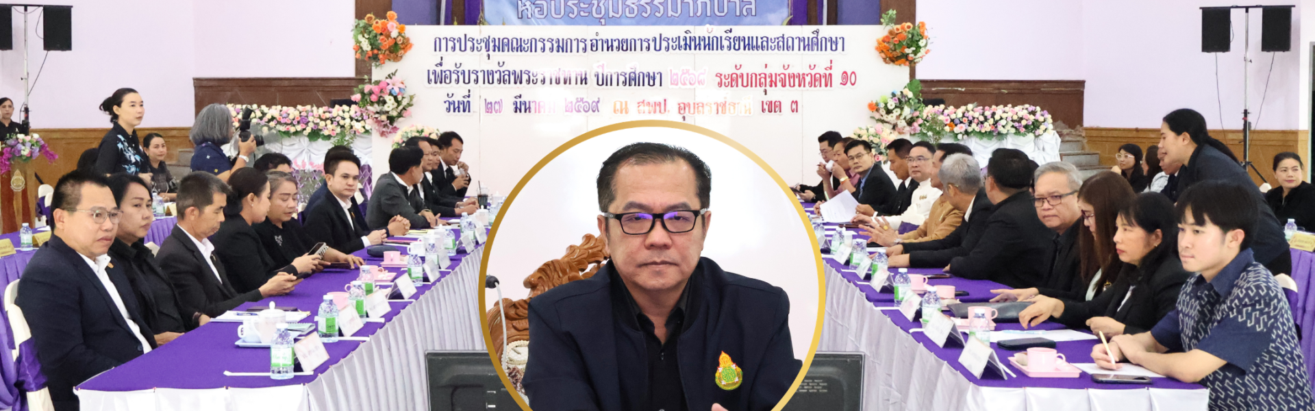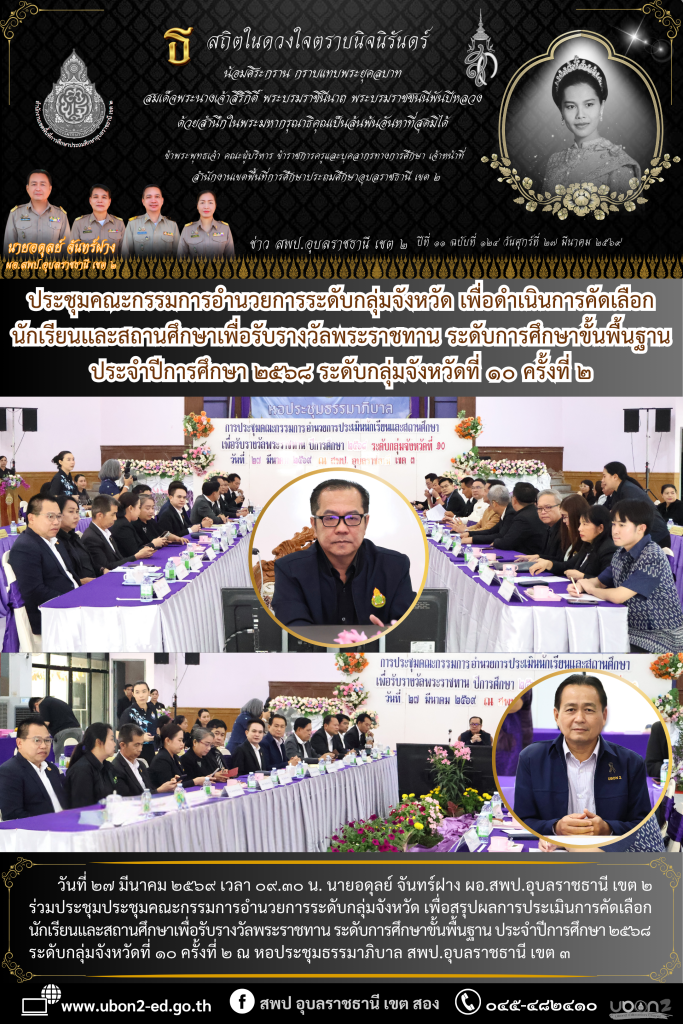วันที่ ๒๗ มีนาคม ๒๕๖๙ เวลา ๐๙.๓๐ น. นายอดุลย์ จันทร์ฝาง ผอ.สพป.อุบลราชธานี เขต ๒ ร่วมประชุมคณะกรรมการอำนวยการระดับกลุ่มจังหวัด เพื่อสรุปผลการประเมินการคัดเลือกนักเรียนเเละสถานศึกษาเพื่อรับรางวัลพระราชทาน ระดับการศึกษาขั้นพื้นฐาน ประจำปีการศึกษา ๒๕๖๘ ระดับกลุ่มจังหวัดที่ ๑๐ ครั้งที่ ๒ ณ หอประชุมธรรมาภิบาล สพป.อุบลราชธานี เขต ๓