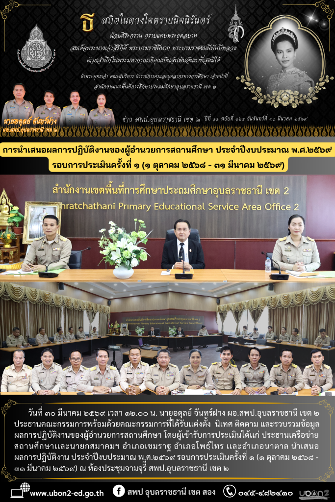 วันที่ ๓๐ มีนาคม ๒๕๖๙ เวลา ๑๒.๐๐ น. นายอดุลย์ จันทร์ฝาง ผอ.สพป.อุบลราชธานี เขต ๒ ประธานคณะกรรมการพร้อมด้วยคณะกรรมการที่ได้รับเเต่งตั้ง นิเทศ ติดตาม และรวบรวมข้อมูลผลการปฏิบัติงานของผู้อำนวยการสถานศึกษา โดยผู้เข้ารับการประเมินได้เเก่ ประธานเครือข่ายสถานศึกษาเเละนายกสมาคมฯ อำเภอเขมราฐ อำเภอโพธฺ์ไทร เเละอำเภอนาตาล นำเสนอผลการปฏิบัติงาน ประจำปีงบประมาณ พ.ศ.๒๕๖๙ รอบการประเมินครั้งที่ ๑ (๑ ตุลาคม ๒๕๖๘ – ๓๑ มีนาคม ๒๕๖๙) ณ ห้องประชุมจามจุรีี สพป.อุบลราชธานี เขต ๒