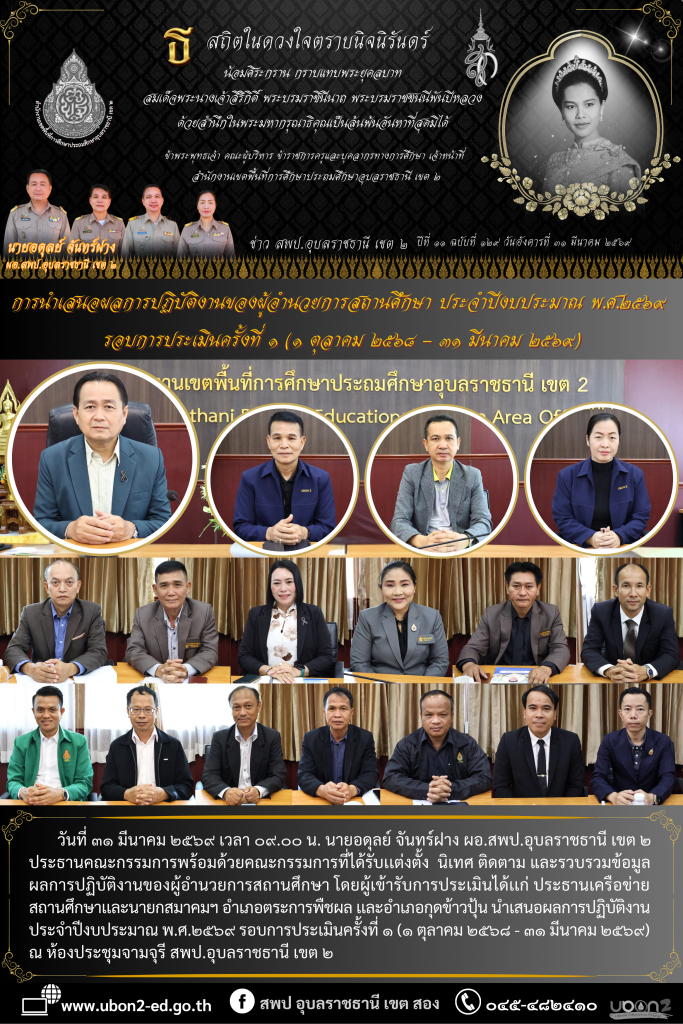 วันที่ ๓๑ มีนาคม ๒๕๖๙ เวลา ๐๙.๐๐ น. นายอดุลย์ จันทร์ฝาง ผอ.สพป.อุบลราชธานี เขต ๒ ประธานคณะกรรมการพร้อมด้วยคณะกรรมการที่ได้รับเเต่งตั้ง นิเทศ ติดตาม และรวบรวมข้อมูลผลการปฏิบัติงานของผู้อำนวยการสถานศึกษา โดยผู้เข้ารับการประเมินได้เเก่ ประธานเครือข่ายสถานศึกษาเเละนายกสมาคมฯ อำเภอตระการพืชผล เเละอำเภอกุดข้าวปุ้น นำเสนอผลการปฏิบัติงาน ประจำปีงบประมาณ พ.ศ.๒๕๖๙ รอบการประเมินครั้งที่ ๑ (๑ ตุลาคม ๒๕๖๘ – ๓๑ มีนาคม ๒๕๖๙) ณ ห้องประชุมจามจุรี สพป.อุบลราชธานี เขต ๒
