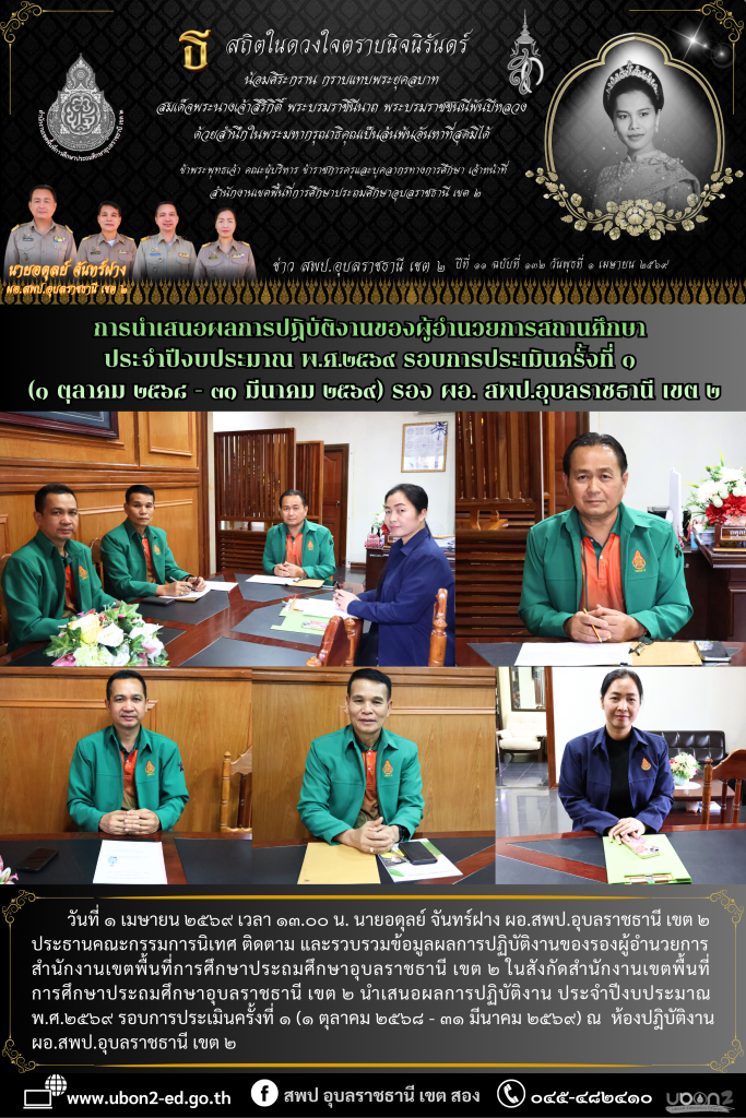 วันที่ ๑ เมษายน ๒๕๖๙ เวลา ๑๓.๐๐ น. นายอดุลย์ จันทร์ฝาง ผอ.สพป.อุบลราชธานี เขต ๒ ประธานคณะกรรมการนิเทศ ติดตาม และรวบรวมข้อมูลผลการปฏิบัติงานของรองผู้อำนวยการสำนักงานเขตพื้นที่การศึกษาประถมศึกษาอุบลราชธานี เขต ๒ ในสังกัดสำนักงานเขตพื้นที่การศึกษาประถมศึกษาอุบลราชธานี เขต ๒ นำเสนอผลการปฏิบัติงาน ประจำปีงบประมาณ พ.ศ.๒๕๖๙ รอบการประเมินครั้งที่ ๑ (๑ ตุลาคม ๒๕๖๘ – ๓๑ มีนาคม ๒๕๖๙) ณ ห้องปฎิบัติงาน ผอ.สพป.อุบลราชธานี เขต ๒