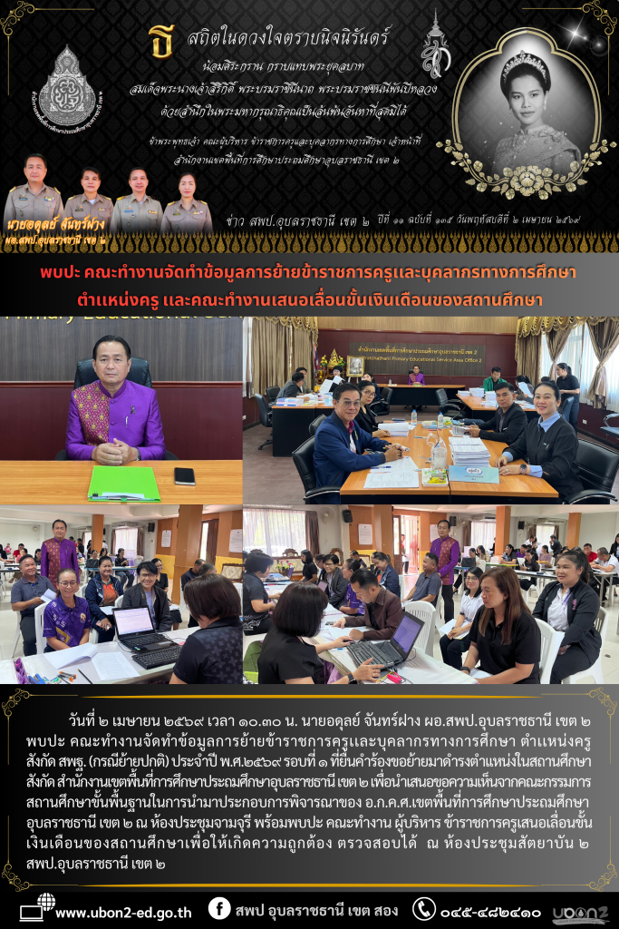 วันที่ ๒ เมษายน ๒๕๖๙ เวลา ๑๐.๓๐ น. นายอดุลย์ จันทร์ฝาง ผอ.สพป.อุบลราชธานี เขต ๒ พบปะ คณะทำงานจัดทำข้อมูลการย้ายข้าราชการครูเเละบุคลากรทางการศึกษา ตำเเหน่งครู สังกัด สพฐ. (กรณีย้ายปกติ) ประจำปี พ.ศ.๒๕๖๙ รอบที่ ๑ ที่ยื่นคำร้องขอย้ายมาดำรงตำเเหน่งในสถานศึกษา สังกัด สำนักงานเขตพื้นที่การศึกษาประถมศึกษาอุบลราชธานี เขต ๒ เพื่อนำเสนอขอความเห็นจากคณะกรรมการสถานศึกษาขั้นพื้นฐานในการนำมาประกอบการพิจารณาของ อ.ก.ค.ศ.เขตพื้นที่การศึกษาประถมศึกษาอุบลราชธานี เขต ๒ ณ ห้องประชุมจามจุรี พร้อมพบปะ คณะทำงาน ผู้บริหาร ข้าราชการครูเสนอเลื่อนขั้นเงินเดือนของสถานศึกษาเพื่อให้เกิดความถูกต้อง ตรวจสอบได้ ณ ห้องประชุมสัตยาบัน ๒ สพป.อุบลราชธานี เขต ๒