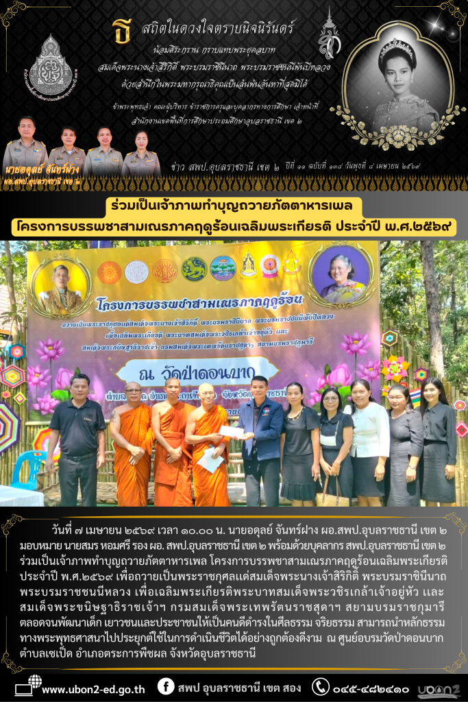 วันที่ ๗ เมษายน ๒๕๖๙ เวลา ๑๐.๐๐ น. นายอดุลย์ จันทร์ฝาง ผอ.สพป.อุบลราชธานี เขต ๒ มอบหมาย นายสมร หอมศรี รอง ผอ. สพป.อุบลราชธานี เขต ๒ พร้อมด้วยบุคลากร สพป.อุบลราชธานี เขต ๒ ร่วมเป็นเจ้าภาพทำบุญถวายภัตตาหารเพล โครงการบรรพชาสามเณรภาคฤดูร้อนเฉลิมพระเกียรติ ประจำปี พ.ศ.๒๕๖๙ เพื่อถวายเป็นพระราชกุศลเเด่สมเด็จพระนางเจ้าสิริกิติ์ พระบรมราชินีนาถ พระบรมราชชนนีหลวง เพื่อเฉลิมพระเกียรติพระบาทสมเด็จพระวชิรเกล้าเจ้าอยู่หัว เเละสมเด็จพระขนิษฐาธิราชเจ้าฯ กรมสมเด็จพระเทพรัตนราชสุดาฯ สยามบรมราชกุมารี ตลอดจนพัฒนาเด็ก เยาวชนเเละประชาชนให้เป็นคนดีดำรงในศีลธรรม จริยธรรม สามารถนำหลักธรรมทางพระพุทธศาสนาไปประยุกต์ใช้ในการดำเนินชีวิตได้อย่างถูกต้องดีงาม ณ ศูนย์อบรมวัดป่าดอนบาก ตำบลเซเป็ด อำเภอตระการพืชผล จังหวัดอุบลราชธานี