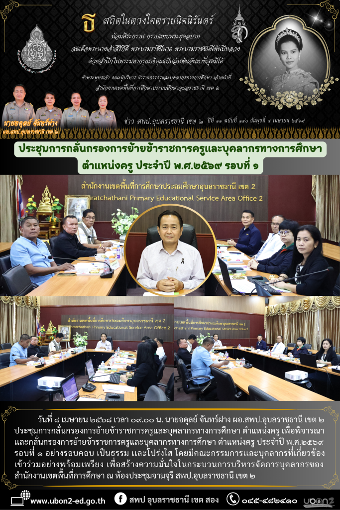 วันที่ ๘ เมษายน ๒๕๖๘ เวลา ๐๙.๐๐ น. นายอดุลย์ จันทร์ฝาง ผอ.สพป.อุบลราชธานี เขต ๒ ประชุมการกลั่นกรองการย้ายข้าราชการครูและบุคลากรทางการศึกษา ตำแหน่งครู เพื่อพิจารณาเเละกลั่นกรองการย้ายข้าราชการครูและบุคลากรทางการศึกษา ตำแหน่งครู ประจำปี พ.ศ.๒๕๖๙ รอบที่ ๑ อย่างรอบคอบ เป็นธรรม เเละโปร่งใส โดยมีคณะกรรมการเเละบุคลากรที่เกี่ยวข้องเข้าร่วมอย่างพร้อมเพรียง เพื่อสร้างความมั่นใจในกระบวนการบริหารจัดการบุคลากรของสำนักงานเขตพื้นที่การศึกษา ณ ห้องประชุมจามจุรี สพป.อุบลราชธานี เขต ๒