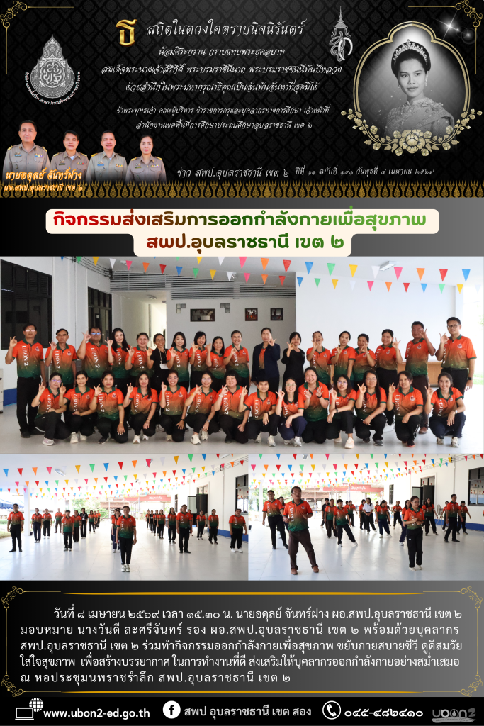 วันที่ ๘ เมษายน ๒๕๖๙ เวลา ๑๕.๓๐ น. นายอดุลย์ จันทร์ฝาง ผอ.สพป.อุบลราชธานี เขต ๒ มอบหมาย นางวันดี ละศรีจันทร์ รอง ผอ.สพป.อุบลราชธานี เขต ๒ พร้อมด้วยบุคลากร สพป.อุบลราชธานี เขต ๒ ร่วมทำกิจกรรมออกกำลังกายเพื่อสุขภาพ ขยับกายสบายชีวี ดูดีสมวัย ใส่ใจสุขภาพ เพื่อสร้างบรรยากาศ ในการทำงานที่ดี ส่งเสริมให้บุคลากรออกกำลังกายอย่างสม่ำเสมอ ณ หอประชุมนพราชรำลึก สพป.อุบลราชธานี เขต ๒