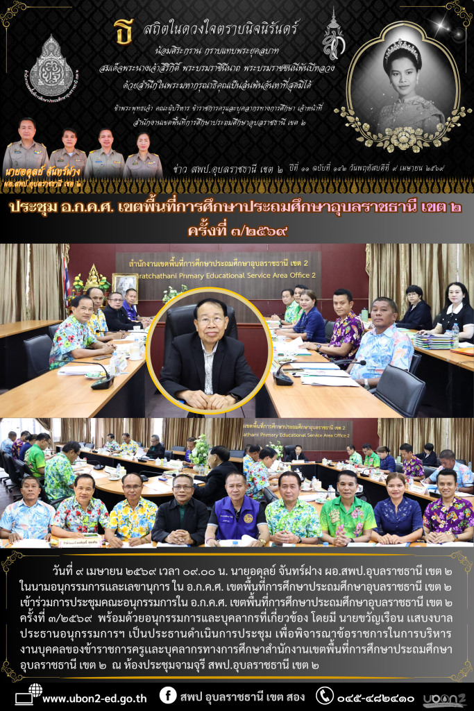 วันที่ ๙ เมษายน ๒๕๖๙ เวลา ๐๙.๐๐ น. นายอดุลย์ จันทร์ฝาง ผอ.สพป.อุบลราชธานี เขต ๒ ในนามอนุกรรมการเเละเลขานุการ ใน อ.ก.ค.ศ. เขตพื้นที่การศึกษาประถมศึกษาอุบลราชธานี เขต ๒ เข้าร่วมการประชุมคณะอนุกรรมการใน อ.ก.ค.ศ. เขตพื้นที่การศึกษาประถมศึกษาอุบลราชธานี เขต ๒ ครั้งที่ ๓/๒๕๖๙ พร้อมด้วยอนุกรรมการและบุคลากรที่เกี่ยวข้อง โดยมี นายขวัญเรือน เเสบงบาล ประธานอนุกรรมการฯ เป็นประธานดำเนินการประชุม เพื่อพิจารณาข้อราชการในการบริหารงานบุคคลของข้าราชการครูเเละบุคลากรทางการศึกษาสำนักงานเขตพื้นที่การศึกษาประถมศึกษาอุบลราชธานี เขต ๒ ณ ห้องประชุมจามจุรี สพป.อุบลราชธานี เขต ๒