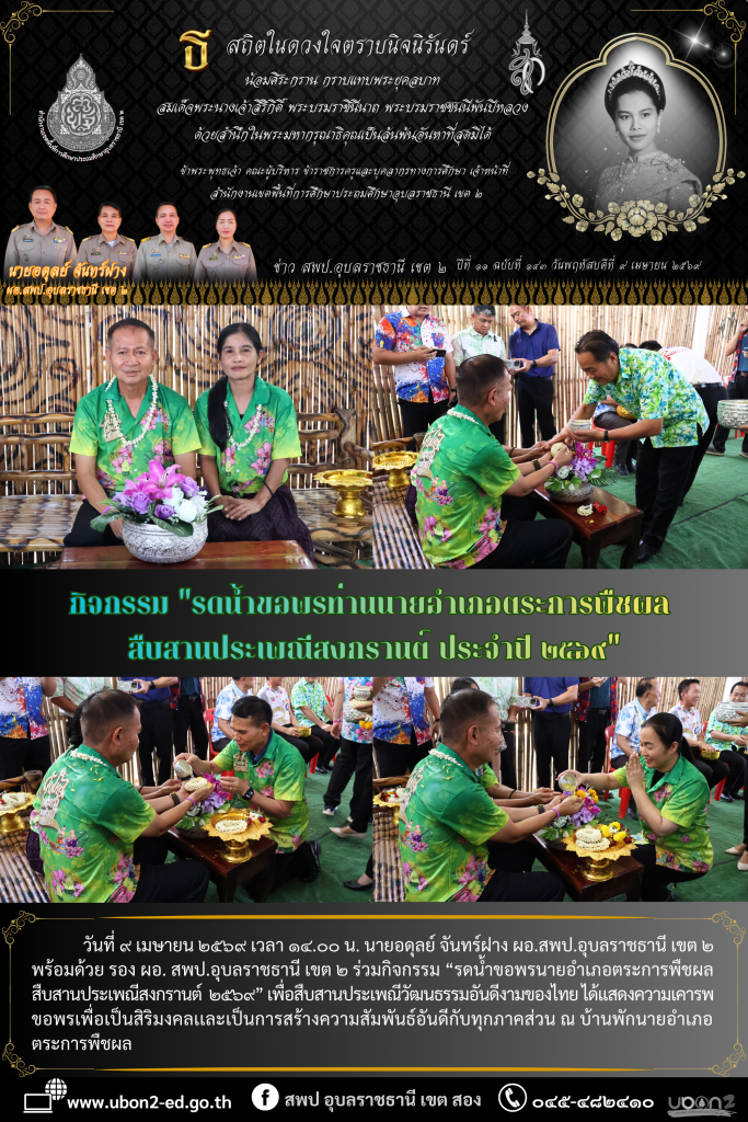 วันที่ ๙ เมษายน ๒๕๖๙ เวลา ๑๔.๐๐ น. นายอดุลย์ จันทร์ฝาง ผอ.สพป.อุบลราชธานี เขต ๒ พร้อมด้วย รอง ผอ. สพป.อุบลราชธานี เขต ๒ ร่วมกิจกรรม “รดน้ำขอพรนายอำเภอตระการพืชผล สืบสานประเพณีสงกรานต์ ๒๕๖๙” เพื่อสืบสานประเพณีวัฒนธรรมอันดีงามของไทย ได้เเสดงความเคารพ ขอพรเพื่อเป็นสิริมงคลเเละเป็นการสร้างความสัมพันธ์อันดีกับทุกภาคส่วน ณ บ้านพักนายอำเภอตระการพืชผล