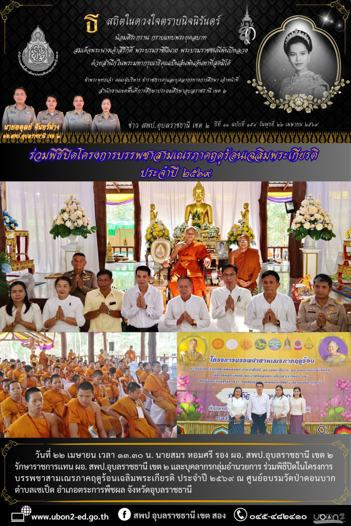 วันที่ ๒๒ เมษายน เวลา ๑๓.๓๐ น. นายสมร หอมศรี รอง ผอ. สพป.อุบลราชธานี เขต ๒ รักษาราชการเเทน ผอ. สพป.อุบลราชธานี เขต ๒ เเละบุคลากรกลุ่มอำนวยการ ร่วมพิธีปิดในโครงการบรรพชาสามเณรภาคฤดูร้อนเฉลิมพระเกียรติ ประจำปี ๒๕๖๙ ณ ศูนย์อบรมวัดป่าดอนบาก ตำบลเซเป็ด อำเภอตระการพืชผล จังหวัดอุบลราชธานี