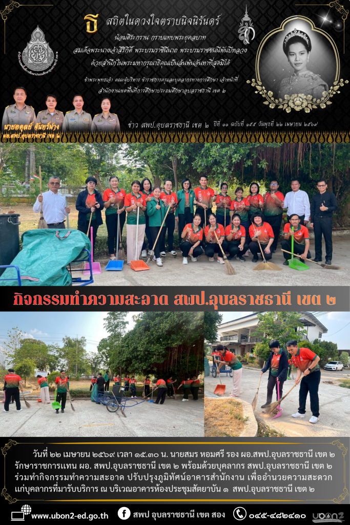 วันที่ ๒๒ เมษายน ๒๕๖๙ เวลา ๑๕.๓๐ น. นายสมร หอมศรี รอง ผอ.สพป.อุบลราชธานี เขต ๒ รักษาราชการเเทน ผอ. สพป.อุบลราชธานี เขต ๒ พร้อมด้วยบุคลากร สพป.อุบลราชธานี เขต ๒ ร่วมทำกิจกรรมทำความสะอาด ปรับปรุงภูมิทัศน์อาคารสำนักงาน เพื่ออำนวยความสะดวกเเก่บุคลากรที่มารับบริการ ณ บริเวณอาคารห้องประชุมสัตยาบัน ๑ สพป.อุบลราชธานี เขต ๒