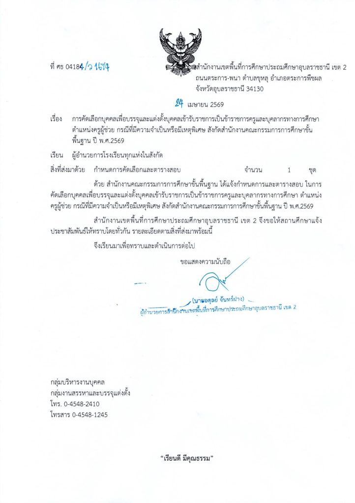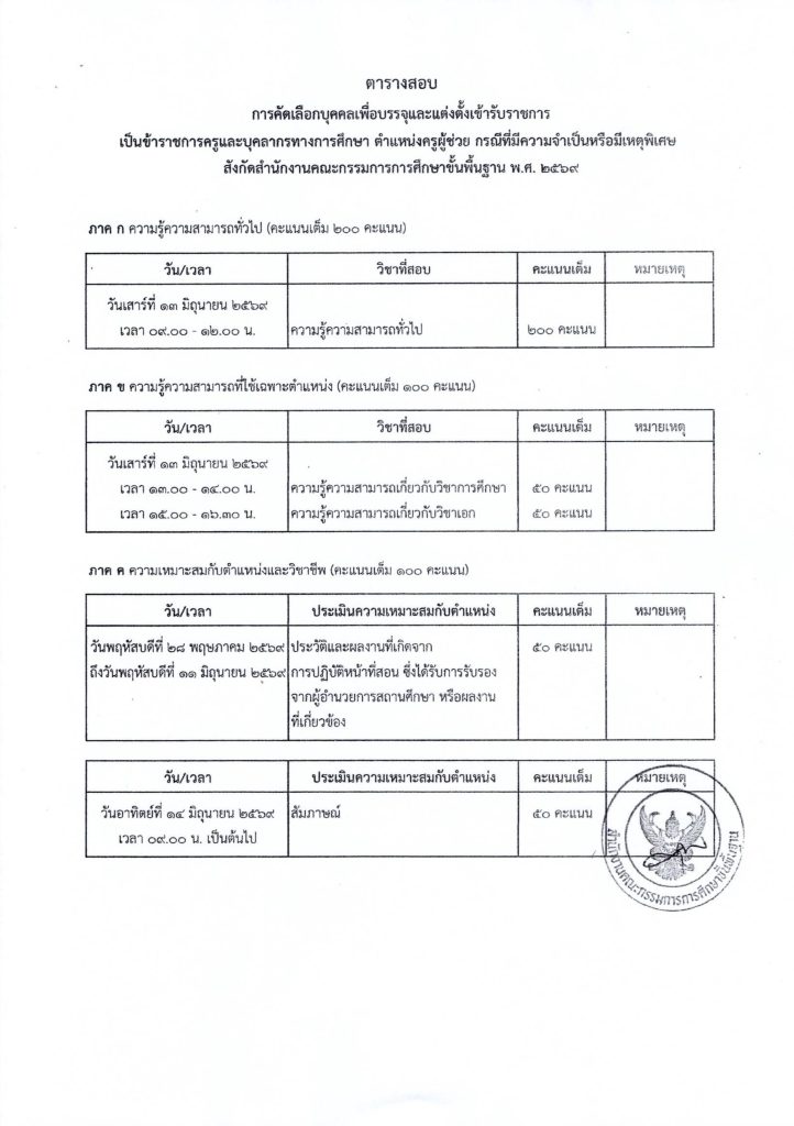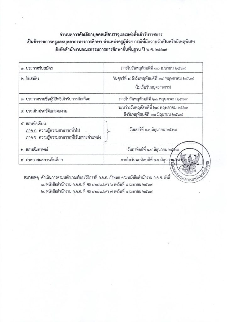 กำหนดการคัดเลือกบุคคลเพื่อบรรจุและแต่งตั้งเข้ารับราชการเป็นข้าราชการครูและบุคลากรทางการศึกษา ตำแหน่งครูผู้ช่วย กรณีที่มีความจำเป็นหรือมีเหตุพิเศษ สังกัดสำนักงานคณะกรรมการการศึกษาขั้นพื้นฐาน ปี พ.ศ.2569