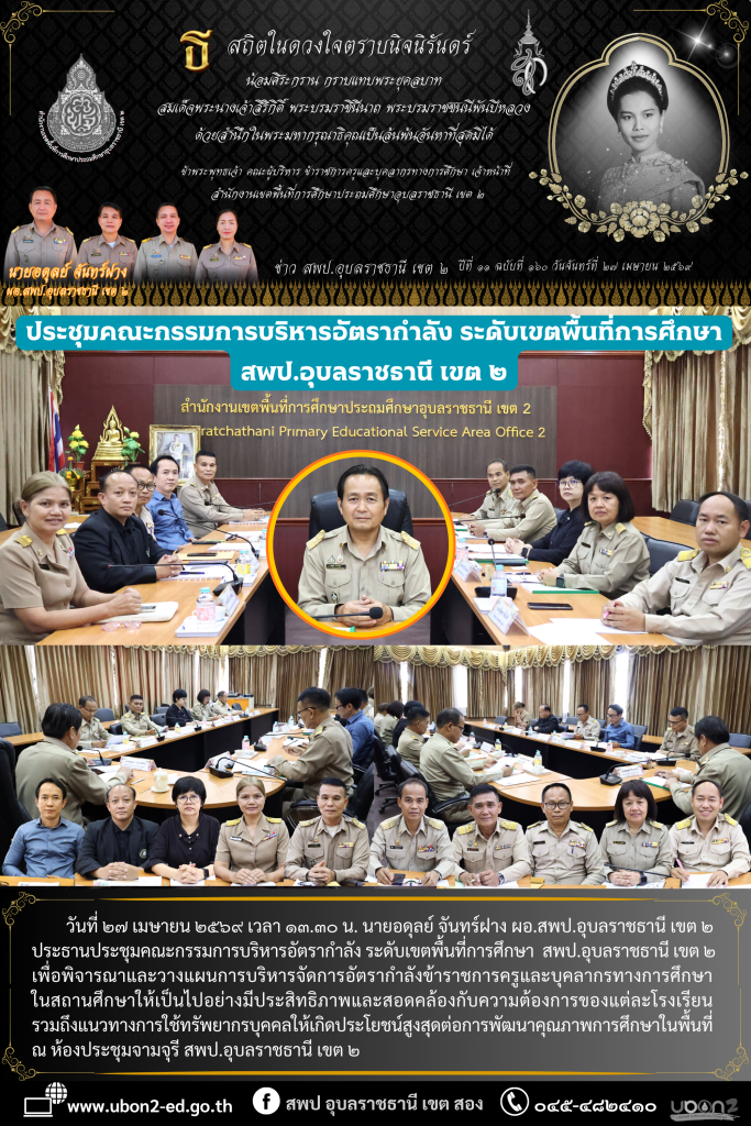 วันที่ ๒๗ เมษายน ๒๕๖๙ เวลา ๑๓.๓๐ น. นายอดุลย์ จันทร์ฝาง ผอ.สพป.อุบลราชธานี เขต ๒ ประธานประชุมคณะกรรมการบริหารอัตรากำลัง ระดับเขตพื้นที่การศึกษา สพป.อุบลราชธานี เขต ๒ เพื่อพิจารณาและวางแผนการบริหารจัดการอัตรากำลังข้าราชการครูและบุคลากรทางการศึกษาในสถานศึกษาให้เป็นไปอย่างมีประสิทธิภาพและสอดคล้องกับความต้องการของแต่ละโรงเรียน รวมถึงแนวทางการใช้ทรัพยากรบุคคลให้เกิดประโยชน์สูงสุดต่อการพัฒนาคุณภาพการศึกษาในพื้นที่ ณ ห้องประชุมจามจุรี สพป.อุบลราชธานี เขต ๒