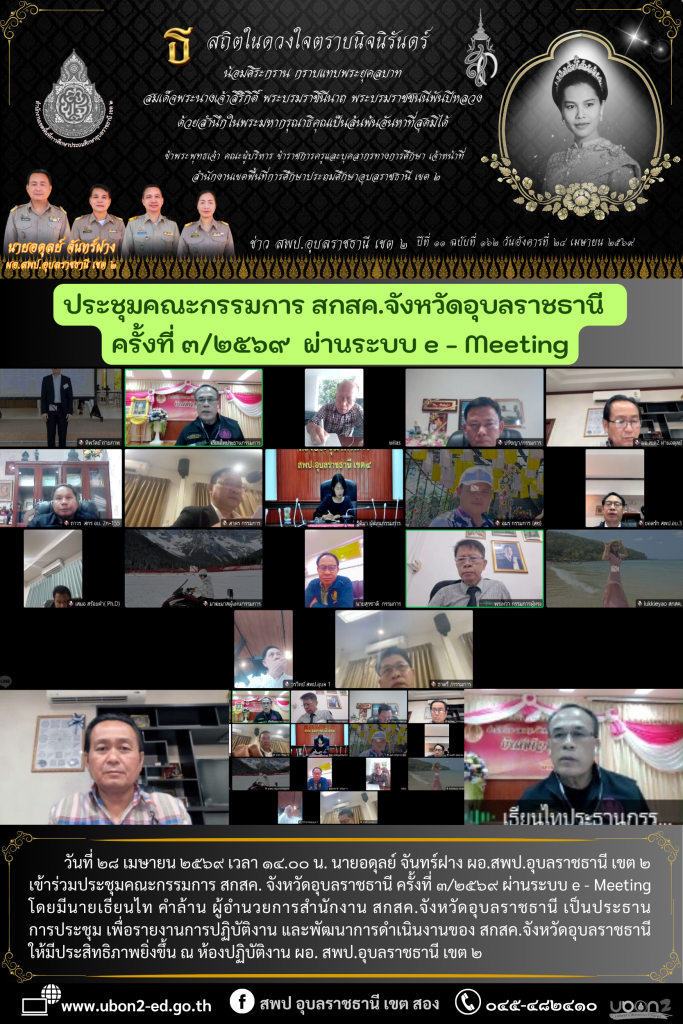 วันที่ ๒๘ เมษายน ๒๕๖๙ เวลา ๑๔.๐๐ น. นายอดุลย์ จันทร์ฝาง ผอ.สพป.อุบลราชธานี เขต ๒ เข้าร่วมประชุมคณะกรรมการ สกสค. จังหวัดอุบลราชธานี ครั้งที่ ๓/๒๕๖๙ ผ่านระบบ e – Meeting โดยมีนายเธียนไท คำล้าน ผู้อำนวยการสำนักงาน สกสค.จังหวัดอุบลราชธานี เป็นประธานการประชุม เพื่อรายงานการปฏิบัติงาน และพัฒนาการดำเนินงานของ สกสค.จังหวัดอุบลราชธานี ให้มีประสิทธิภาพยิ่งขึ้น ณ ห้องปฏิบัติงาน ผอ. สพป.อุบลราชธานี เขต ๒
