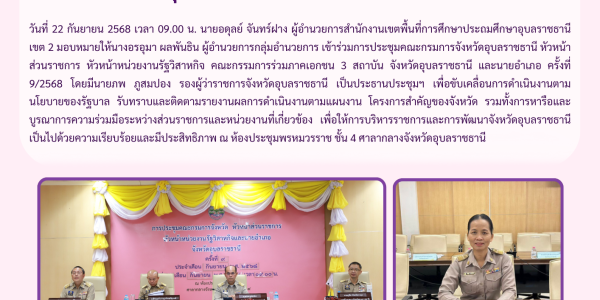 วันที่ 22 กันยายน 2568 เวลา 09.00 น. นายอดุลย์ จันทร์ฝาง ผู้อำนวยการสำนักงานเขตพื้นที่การศึกษาประถมศึกษาอุบลราชธานี เขต 2 มอบหมายให้นางอรอุมา ผลพันธิน ผู้อำนวยการกลุ่มอำนวยการ เข้าร่วมการประชุมคณะกรมการจังหวัดอุบลราชธานี หัวหน้าส่วนราชการ หัวหน้าหน่วยงานรัฐวิสาหกิจ คณะกรรมการร่วมภาคเอกชน 3 สถาบัน จังหวัดอุบลราชธานี และนายอำเภอ ครั้งที่ 9/2568 โดยมีนายภพ ภูสมปอง รองผู้ว่าราชการจังหวัดอุบลราชธานี เป็นประธานประชุมฯ เพื่อขับเคลื่อนการดำเนินงานตามนโยบายของรัฐบาล รับทราบและติดตามรายงานผลการดำเนินงานตามแผนงาน โครงการสำคัญของจังหวัด รวมทั้งการหารือและบูรณาการความร่วมมือระหว่างส่วนราชการและหน่วยงานที่เกี่ยวข้อง เพื่อให้การบริหารราชการและการพัฒนาจังหวัดอุบลราชธานีเป็นไปด้วยความเรียบร้อยและมีประสิทธิภาพ ณ ห้องประชุมพรหมวรราช ชั้น 4 ศาลากลางจังหวัดอุบลราชธานี